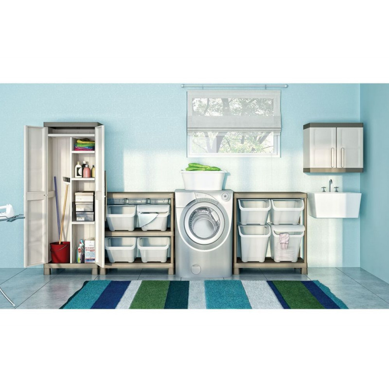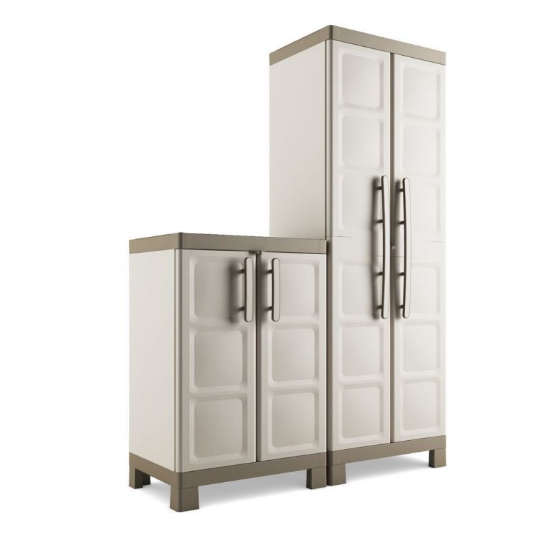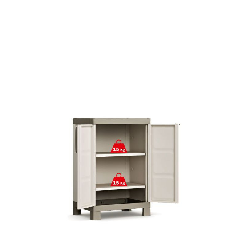Nízka plastová skriňa LOW obsahuje 2 poličky, z ktorých každá unesie 15 kg. Vznikajú tak tri úložné priestory vhodné na skladovanie uterákov, oblečenia, saponátov, ale aj kancelárskych a iných potrieb. Vďaka vybaveniu umožňujúcemu skriňu zamknúť na visací zámok sa Excellence LOW hodí aj do spoločných priestorov klubov, recepcií a učební.