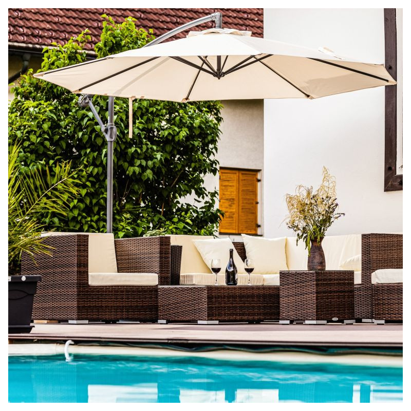 Slnečník vrátane poťahu je vyrobený z pevného polyesteru 180 g/m² so stabilnou oceľovou konštrukciou a ponúka mnoho farieb. Náš slnečník je možné pohodlne otvoriť a zavrieť pomocou ručnej kľučky. Optimálny tieň získate vďaka nastaviteľnému uhlu slnečníka a otočnému ramenu do všetkých strán. Slnečník poskytuje ochranu pred slnečnými lúčmi, cirkuláciu vzduchu podporuje integrovaná strieška, ktorá zabraňuje hromadeniu tepla. Vodoodpudivý poťah navyše poskytuje ochranu proti miernemu dažďu.