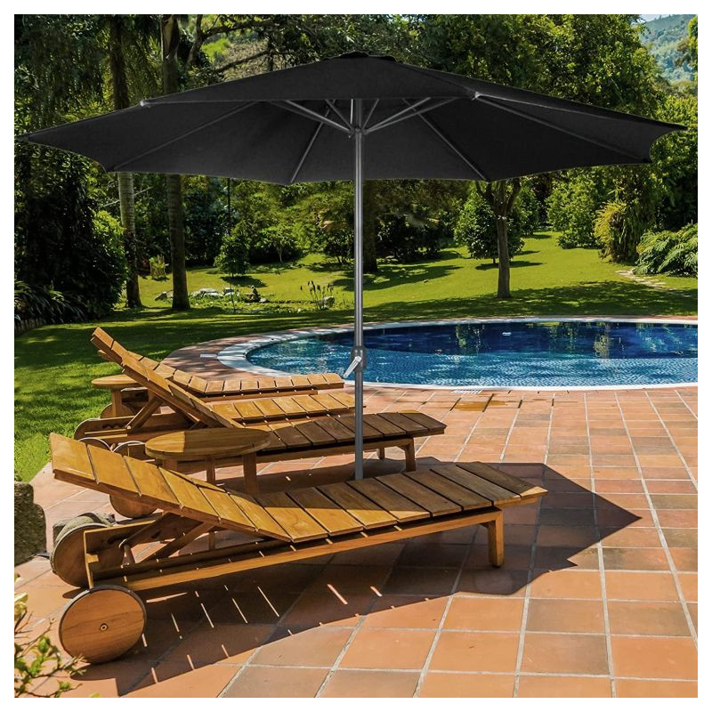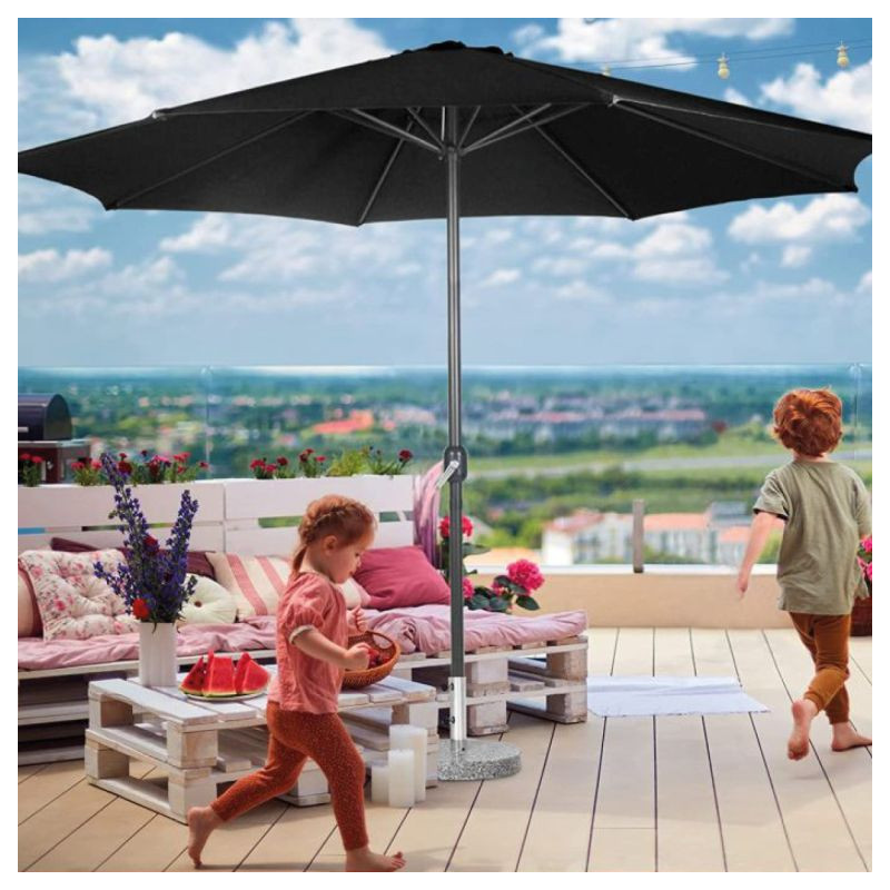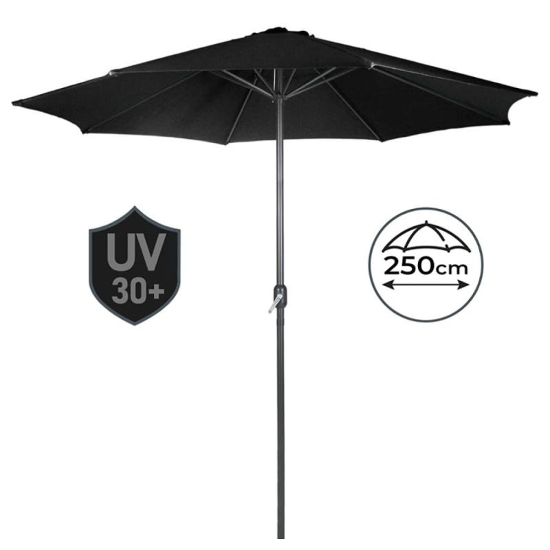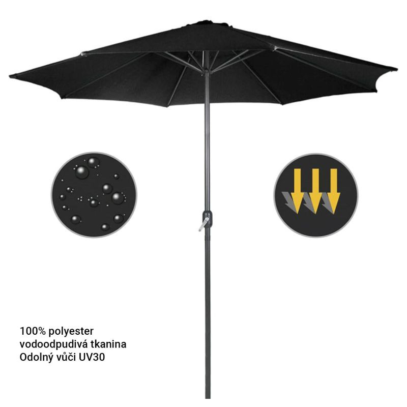 Tento elegantný slnečník s kľukou v čiernej farbe dodá Vašej záhradnej dekorácii zvláštny šarm. Vďaka navíjaciemu mechanizmu je možné slnečník vonku ľahko otvoriť a zavrieť. Prístrešok slnečníka sa ľahko čistí. Záhradný slnečník je vyrobený z vodoodpudivej polyesterovej tkaniny.