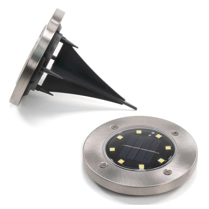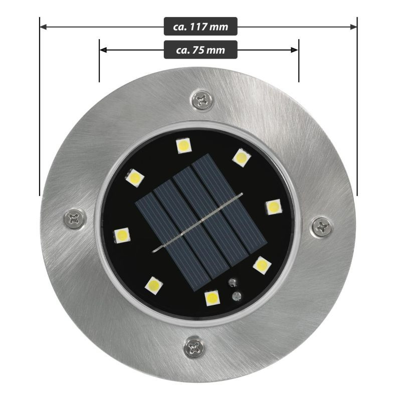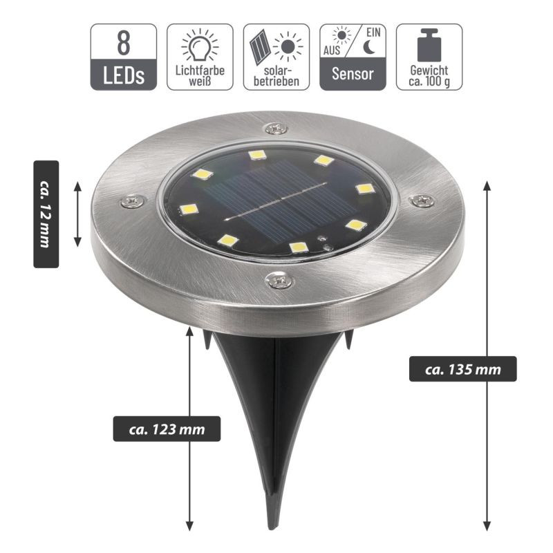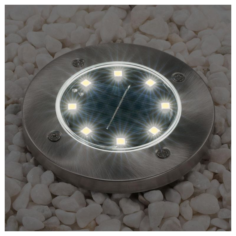 Solárne bodové svietidlo s 8 LED je okrúhle, bezpečné a odolné voči poveternostným vplyvom. Horný krúžok je vyrobený z nerezovej ocele. Senzor automaticky zapne svietidlo za súmraku. Plne nabitý solárny článok zaistí prevádzku po dobu približne 8 hodín. Počas dňa sa integrované batérie dobíjajú prostredníctvom solárnych článkov pomocou solárnej energie. Ideálne pre vjazd do garáže, chodníky, terasy alebo schodíky.