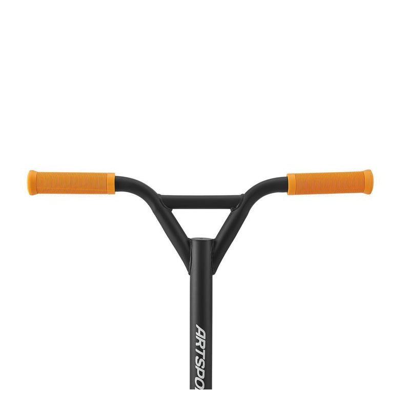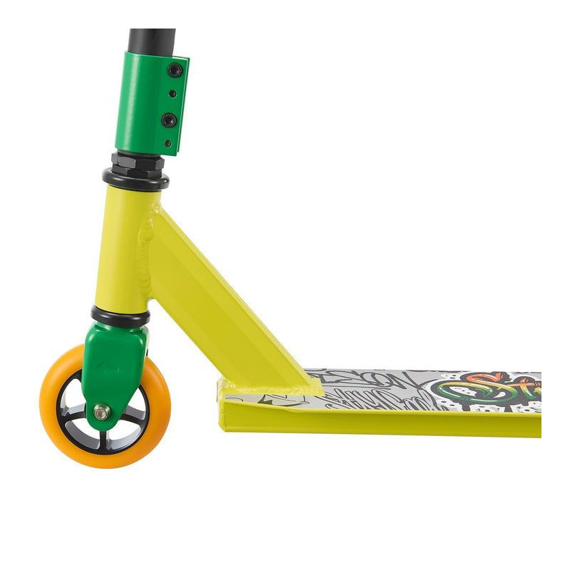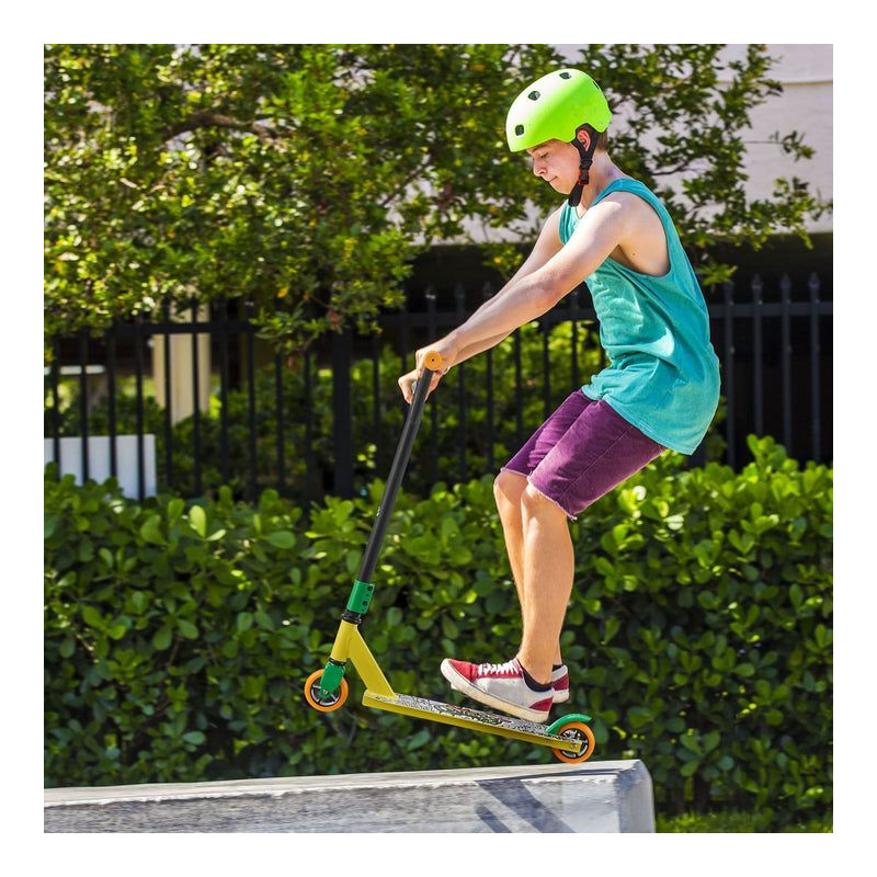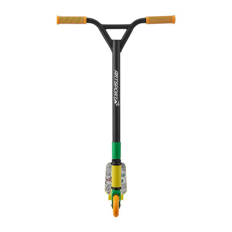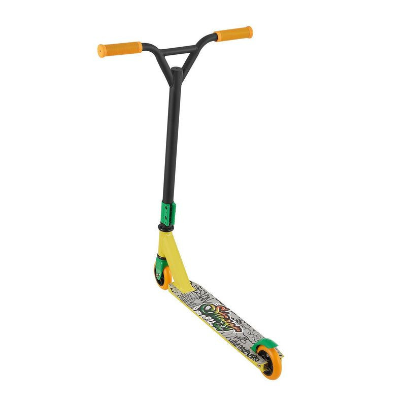Stabilná konštrukcia z hliníka a ocele zaručuje bezpečnosť pri jazde a skákaní. 100 mm PU kolieska s hliníkovým jadrom a ložiskami ABEC 9 zaručujú plynulú a rýchlu jazdu. Otočné riadidlá o 360°, TPR rukoväte a protišmykový povrch umožňujú ľahké ovládanie a pohodlie. Kolobežka je čiastočne zmontovaná a pripravená na okamžité použitie.