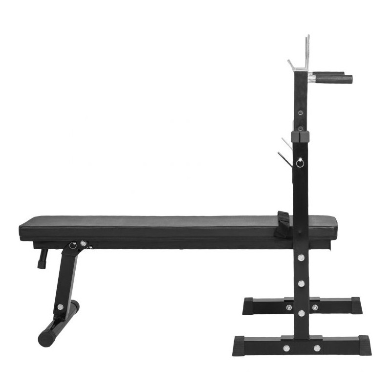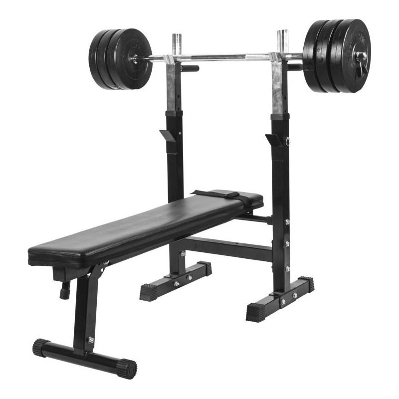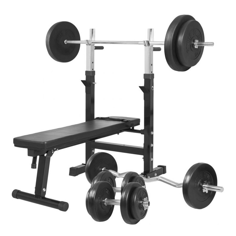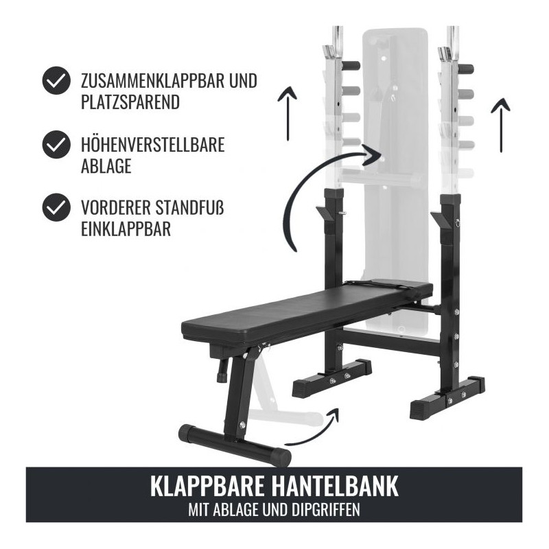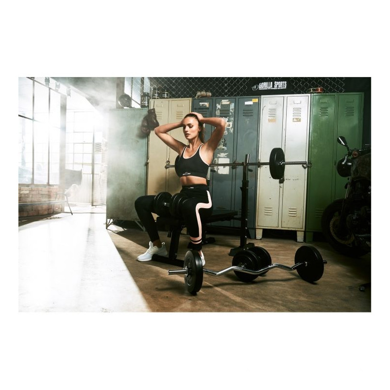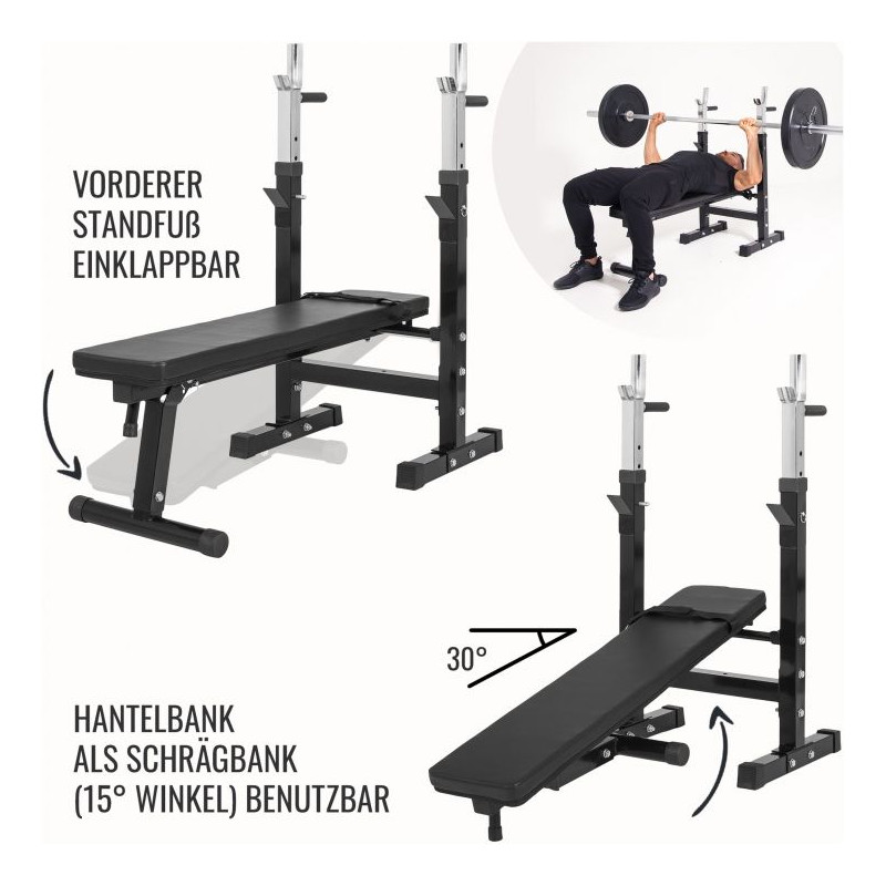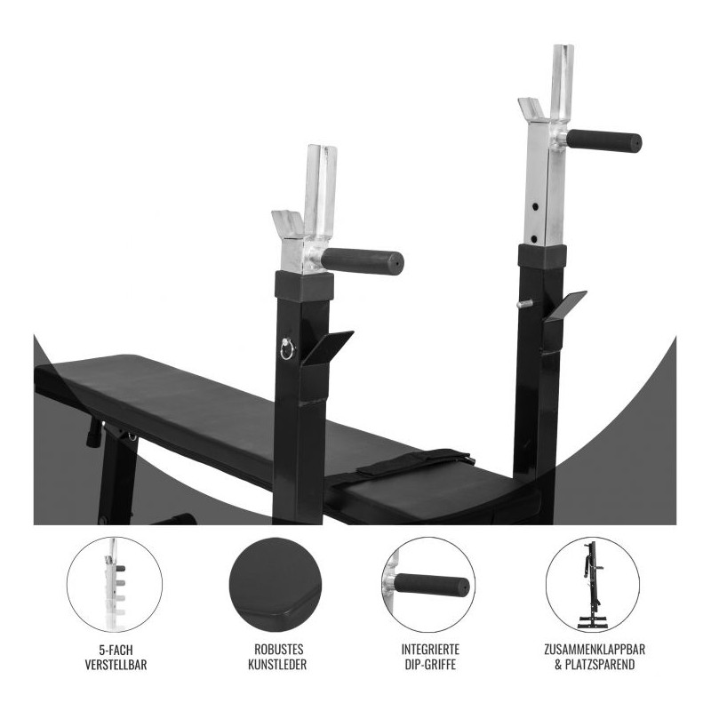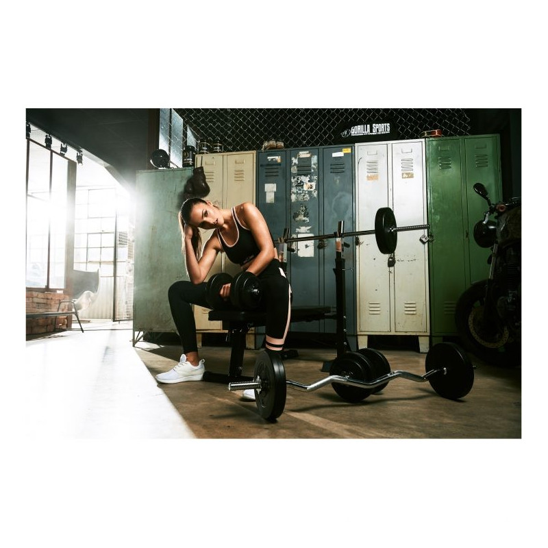 Posilňovací lavica s činkou 100 kg od spoločnosti Gorilla Sports je komplexná kompletná sada pre začiatočníkov aj pokročilých cvičencov. Integrované úchyty pre dip na nastaviteľnom stojane na činky, bezpečnostný popruh na nohy a plastová kompletná sada 100 kg s tyčami, taliermi a zámky sú vhodné pre efektívne cvičenie pre cielené budovanie svalov.
