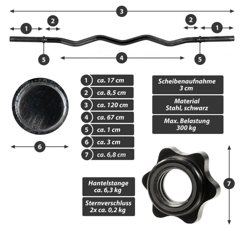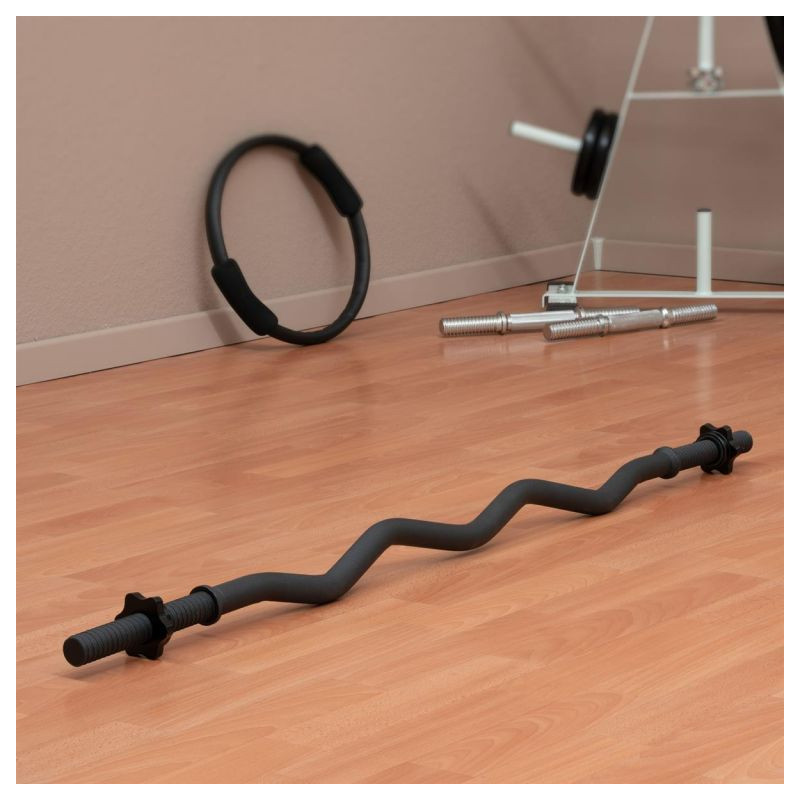 Optimálna činka na použitie v posilňovni aj doma. Zakrivený tvar tyče umožňuje rôzne možnosti úchopu na použitie rôznych partií svalov paží a umožňuje cielene precvičovať konkrétne svalové skupiny i komplexné precvičenie celého tela. Ideálne pre náročný tréning s menšou záťažou zápästia ako s činkou. Vďaka zakrivenému tvaru je obzvlášť vhodná pre efektívny a efektívny tréning paží. Je vhodná pre dostupné záťažové dosky s priemerom otvoru 30 mm. Hviezdicové zámky, ktoré je možné rýchlo vymeniť, bezpečne fixujú závažia na tyči činky a zaručujú jednoduchú výmenu závaží.