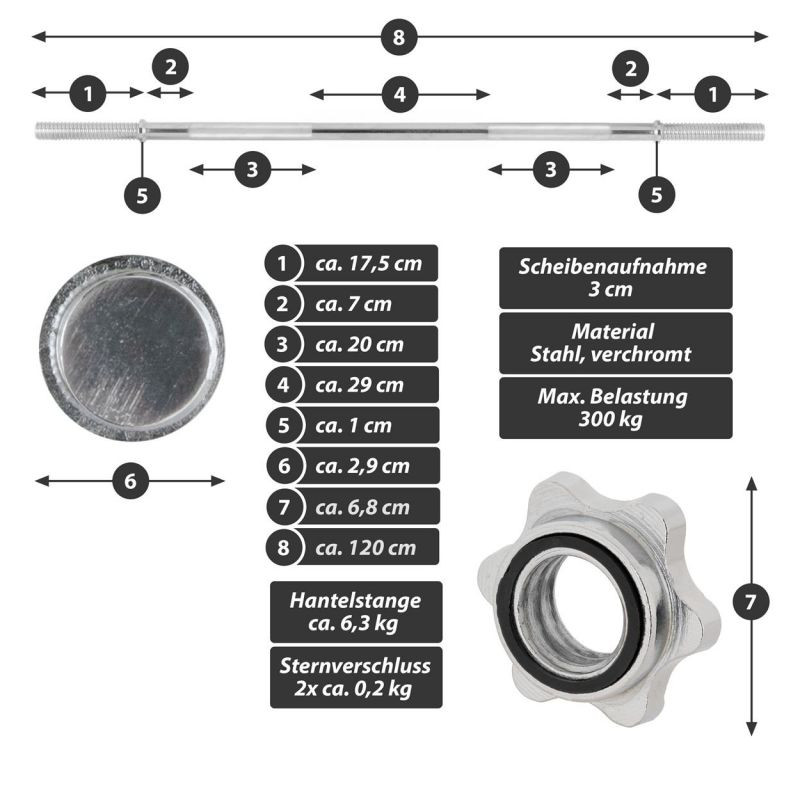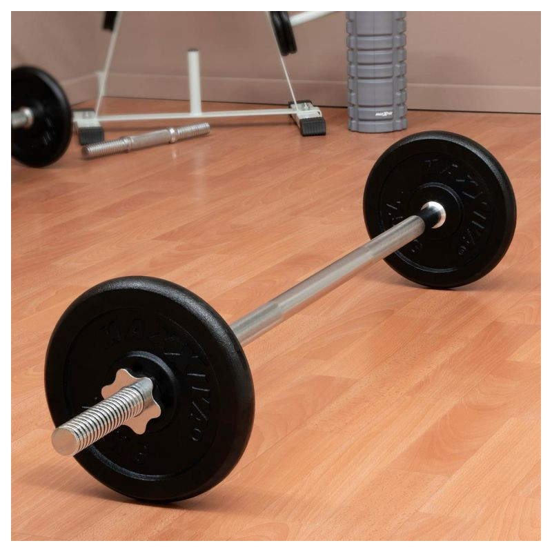Podperná tyč na činky MAXXIVA® je vhodná pre všetky komerčne dostupné záťažové dosky s 3 cm držiakom dosky. Pultová doska je upevnená poistným krúžkom, ktorý zabraňuje skĺznutiu závažia počas pohybu. Rýchlovýmenné hviezdicové zámky bezpečne upevňujú závažia na činku a zaručujú pohodlnú výmenu závaží. Rukoväte s krížovým závitom na tyči umožňujú bezpečné uchopenie tyče.