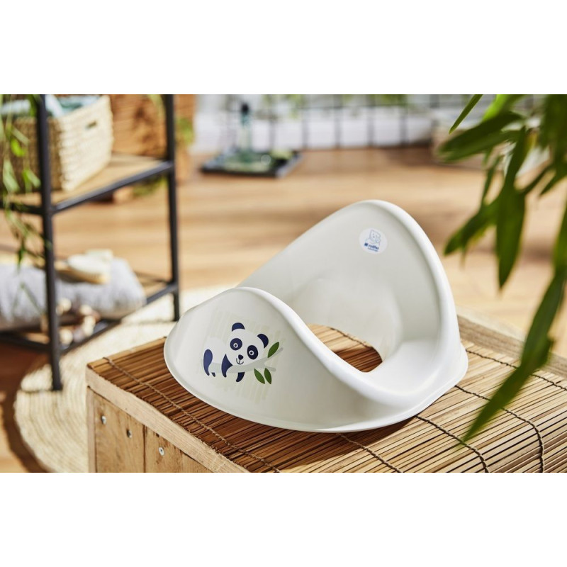 Sedátko na WC z bio materiálu. Organicky biela farba s potlačou pandy. Sedátko z 95% prírodných surovín odbúrateľných zo 100% (Materiál: 70% cukor, 20% minerály, 5% materiál na fosílnej báze). Ergonomický tvar zaistí bezpečné a pohodlné používanie. Sedátko sa hodí na všetky bežné WC a pripevnenie je veľmi jednoduché. Vyrobené v Nemecku.