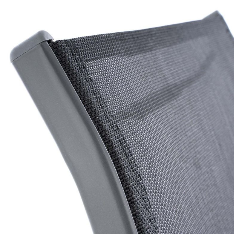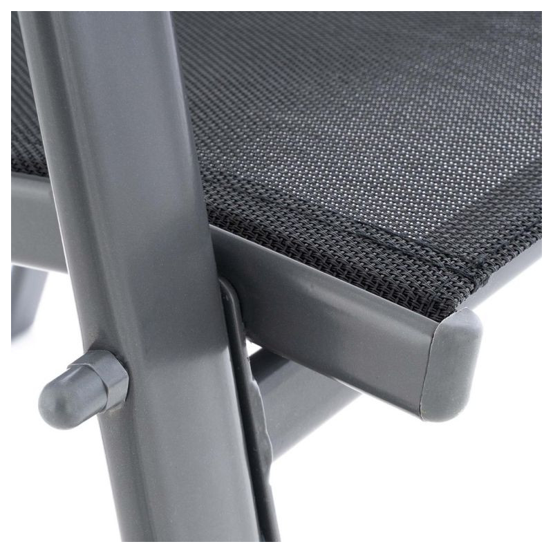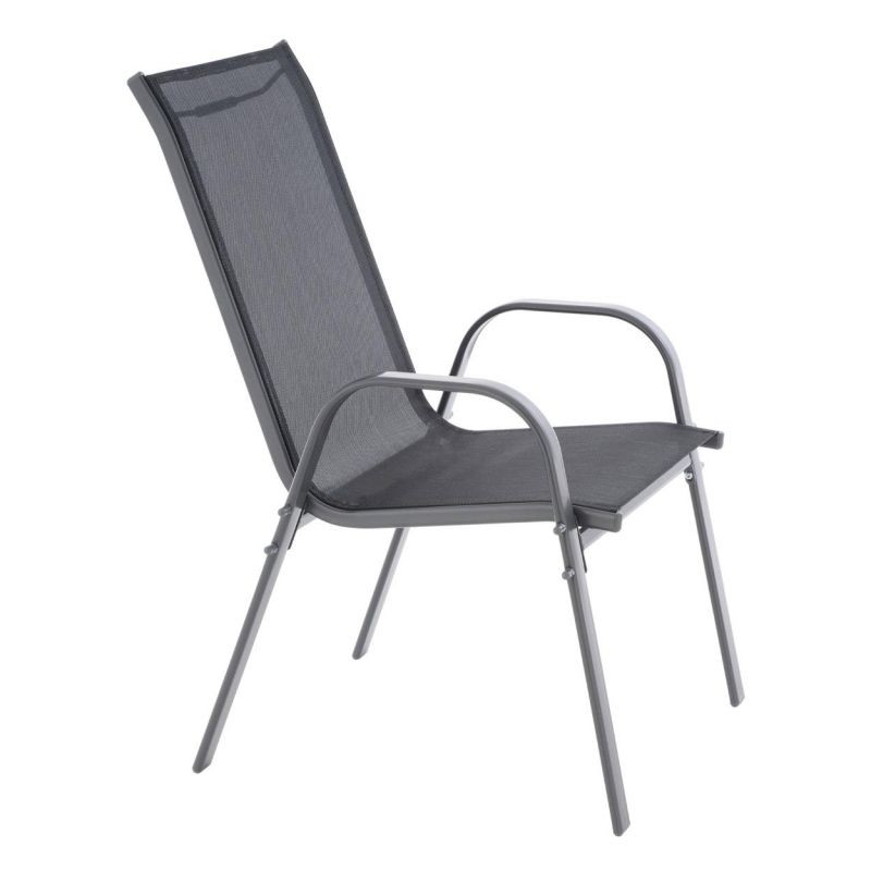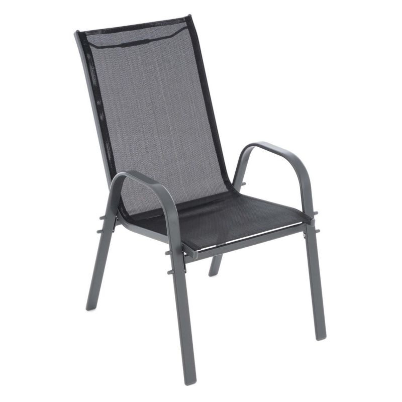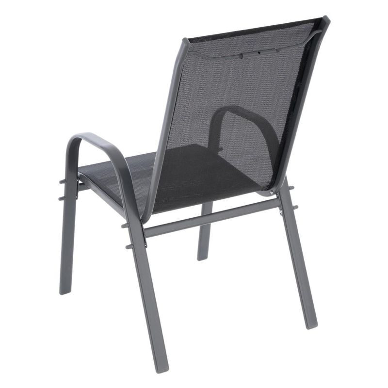 Kreslo je vybavené opierkami a vysokým operadlom pre pohodlné sedenie. Konštrukcia je vyrobená z dvojitého oceľového rámu s práškovým nástrekom, sedák je potiahnutý čiernou elastickou textíliou. Materiály použité na tejto stoličke sú bezúdržbové, odolné voči poveternostným vplyvom a nevyžadujú žiadne špeciálne čistiace prostriedky. Toto kreslo je ideálne pre vnútorné i vonkajšie použitie. Stolička je čiastočne rozložená a možno ju ľahko stohovať na seba, vďaka tomu ušetríte miesto.