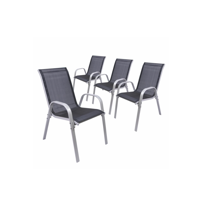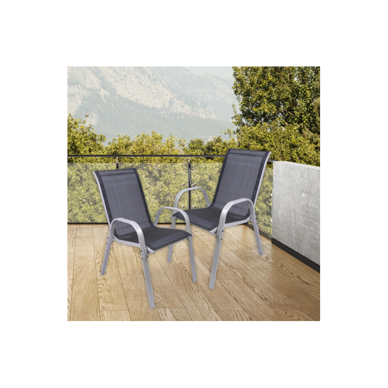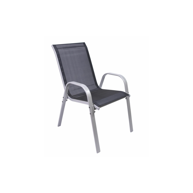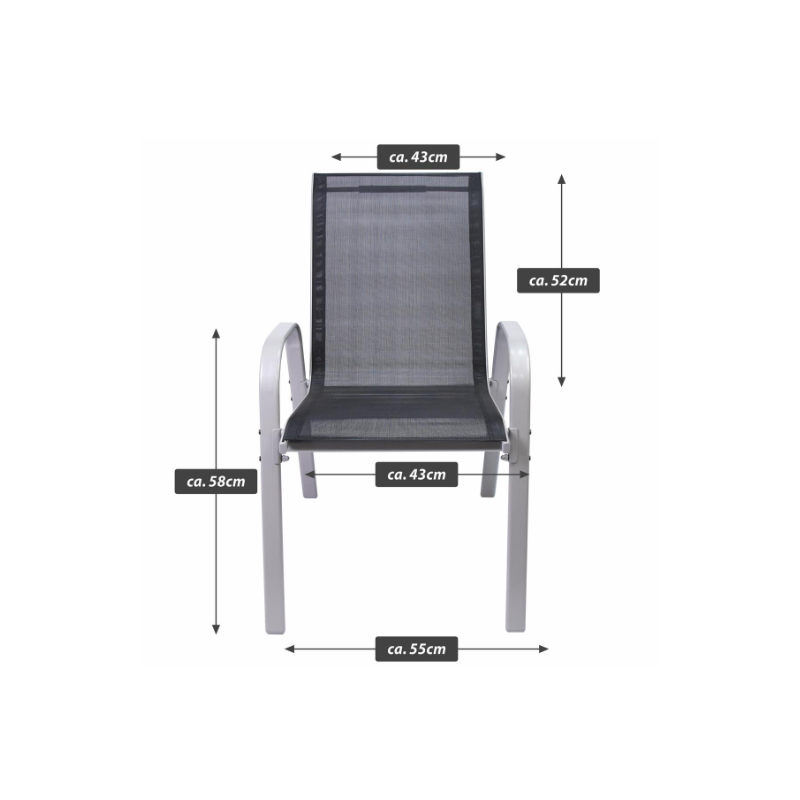 Tieto robustné stoličky kombinujú stohovateľný oceľový rám s čiernym textilným poťahom – materiály, ktoré sú odolné voči poveternostným vplyvom a ľahko sa udržiavajú. S rozmermi 90 × 55 × 65 cm a výškou sedadla 42 cm poskytujú pevné a pohodlné sedenie. Dajú sa perfektne stohovať a šetria miesto, čo je ideálne pre praktické použitie v záhrade aj doma.