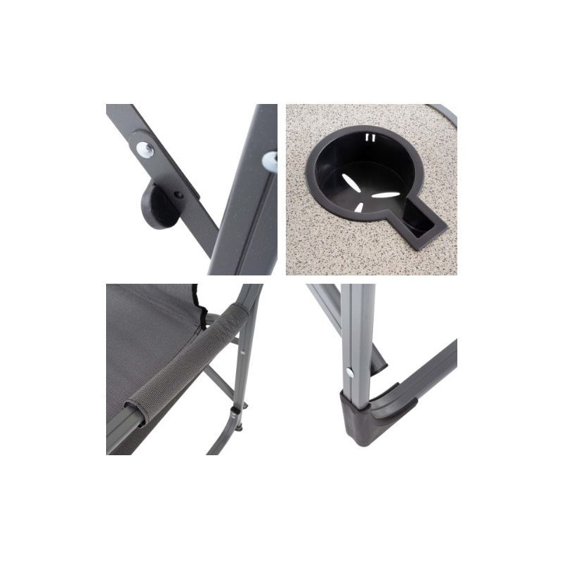 Skladacia stolička je ideálnym mobilným posedením a je všestranná - či už kempujete alebo rybárčite, na záhrade, na piknikovom výlete s deťmi, na zápase vášho obľúbeného mužstva alebo na festivale. Sklopný stolík má na pravej strane držiak nápojov, takže sa môžete najesť bez potreby ďalšieho stola.