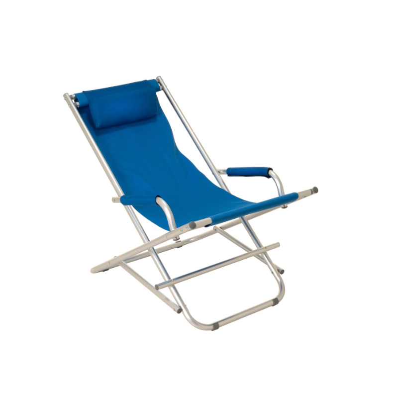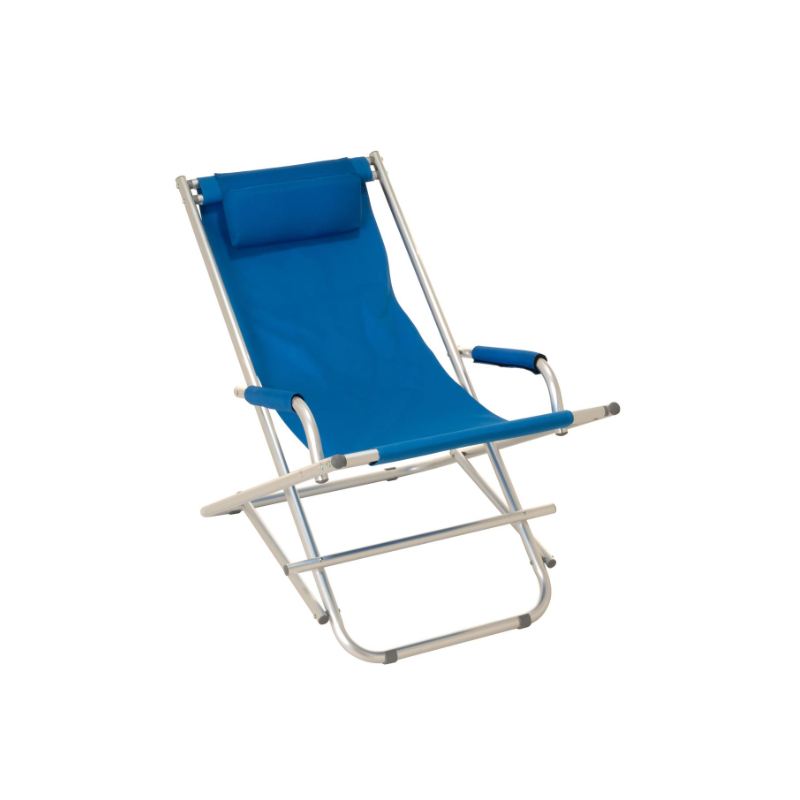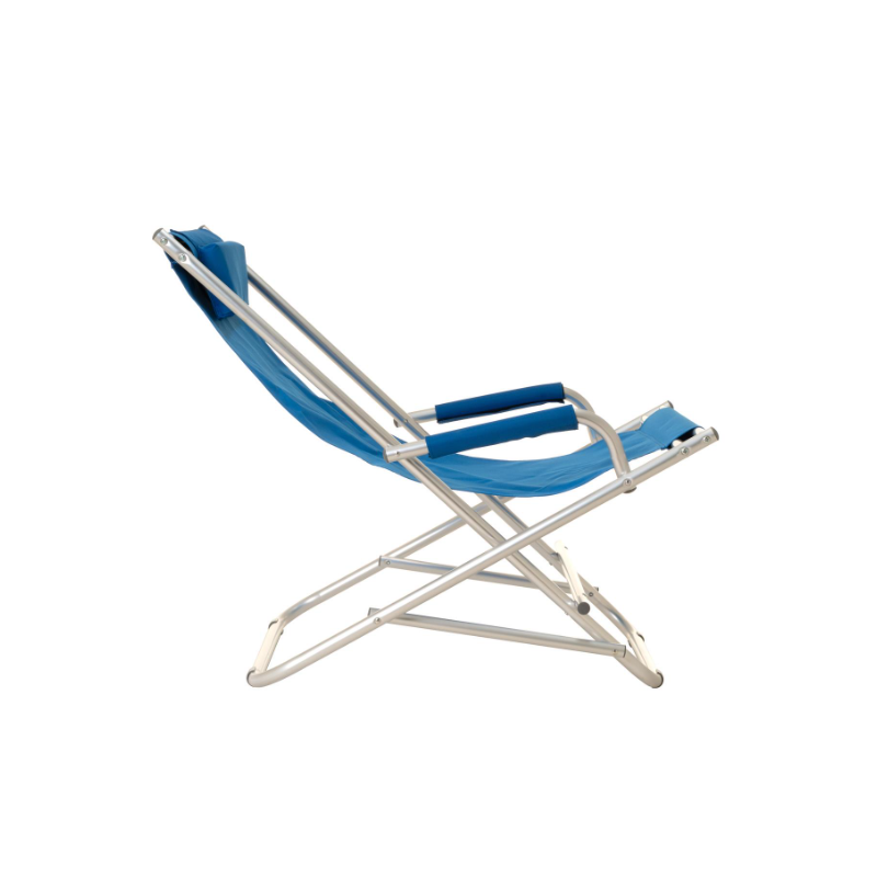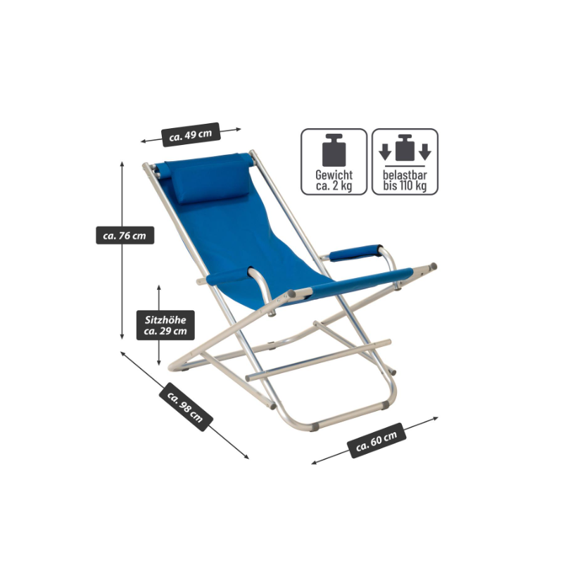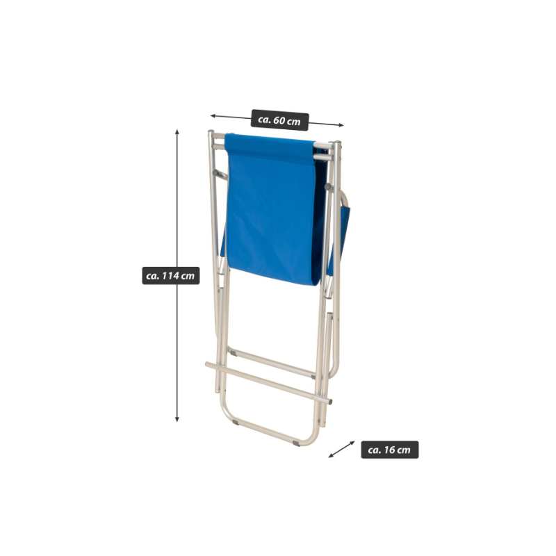 Skladacie piknikové kreslo, ktoré sa rýchlo postaví a pripraví na použitie a rovnako rýchlo zase zbalí. Rám stoličky je vyrobený zo šedého lakovaného hliníka a modrého PVC poťahu. Materiál je mäkký a prispôsobí sa kontúram vášho tela. PVC tkanina záhradnej stoličky je vodoodpudivá a udrží až 110 kg. Hliníkový rám je stabilný a má protišmykové nožičky s profilmi. Vďaka tomu je skladacia stolička ideálnym spoločníkom na záhradu, terasu, pláž, piknik, festivaly, rybárčenie a kempovanie. Skladacie stoličky ponúkajú maximálnu flexibilitu, sú praktické, pohodlné, stabilné, robustné, odolné proti poveternostným vplyvom, ľahké a šikovné. Sú to často používané kusy nábytku na záhradách a na terasách, najmä v lete. Všimnite si tiež naše ďalšie letné/záhradné predmety, ako sú stohovacie stoličky, záhradné stoly, lavičky, slnečníky, stojany na dáždniky, stoličky vyrobené z najrôznejších materiálov av rôznych veľkostiach a farbách.