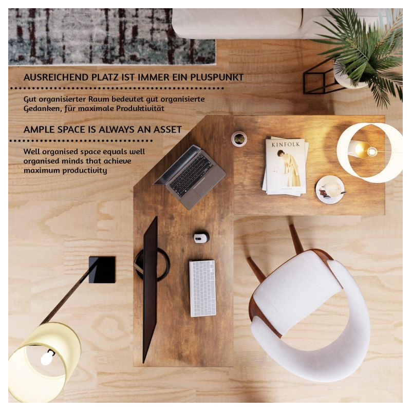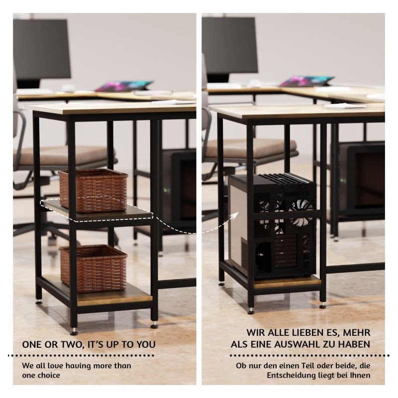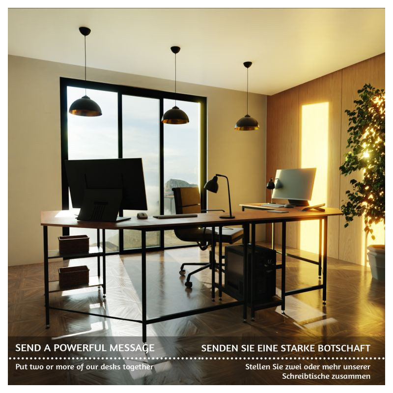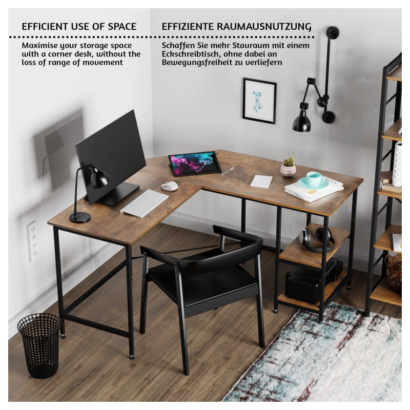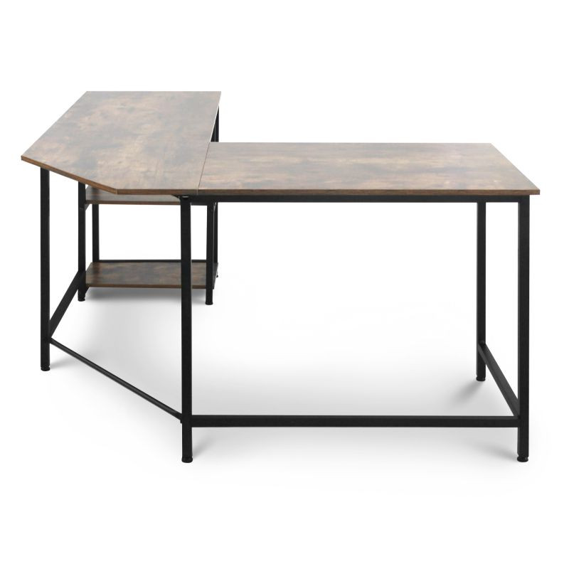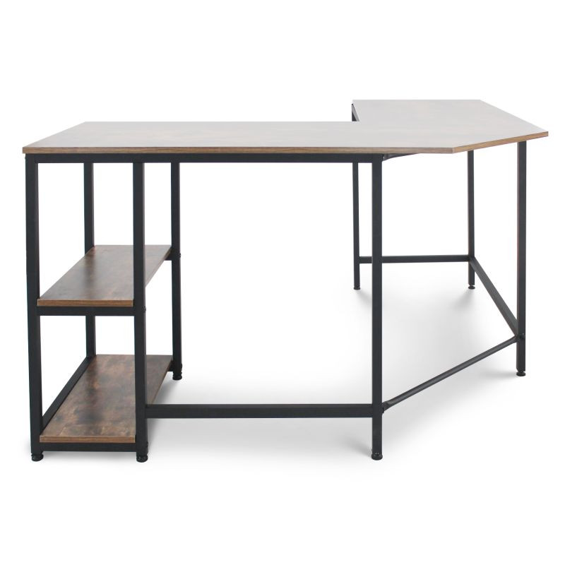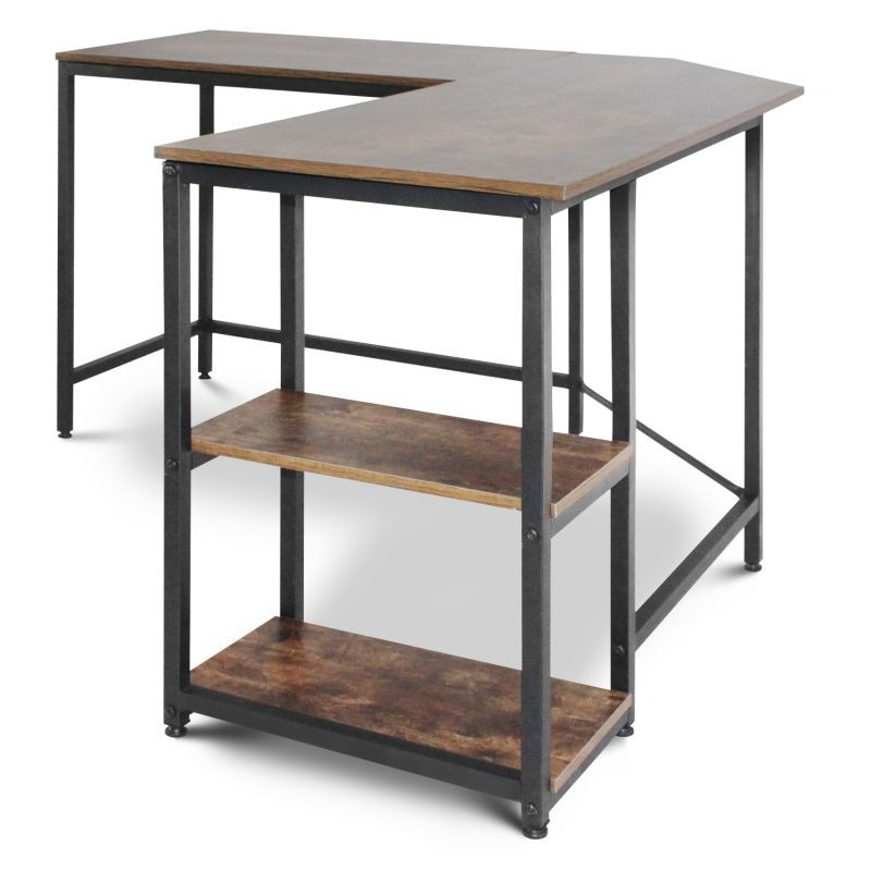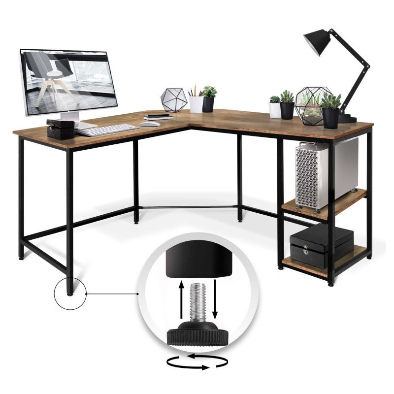 Tento počítačový pracovný stôl kombinuje odvážnu eleganciu kovového rámu s prirodzeným pôvabom rustikálnej hnedej dosky pripomínajúcej drevo. Predstavuje dokonalú kombináciu estetiky a funkčnosti. Náš všestranný písací stôl má dve priestranné pracovné plochy, dve bočné police a praktickú priehlbinu v rohu, do ktorej môžete uložiť všetky káble mimo dohľad. Rohový písací stôl má veľkorysé rozmery, takže na neho môžete ľahko umiestniť počítač, všetko súvisiace vybavenie a príslušenstvo, a napriek tomu na ňom udržať poriadok.