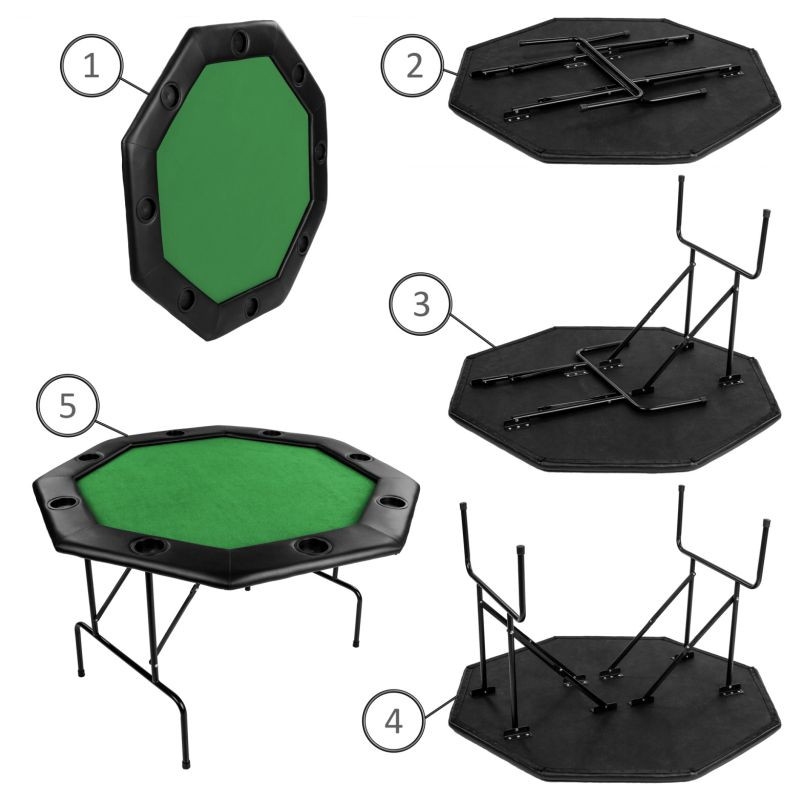 Poťah z prémiovej plsti a polstrované koženkové lakťové opierky poskytujú pokrovému stolu sofistikovaný vzhľad. Pokrový stôl možno rýchlo a priestorovo úsporne sklopiť iba na výšku 12 cm. Stôl je vhodný pre 8 hráčov, pričom na doske je umiestnených 8 držiakov na nápoj.