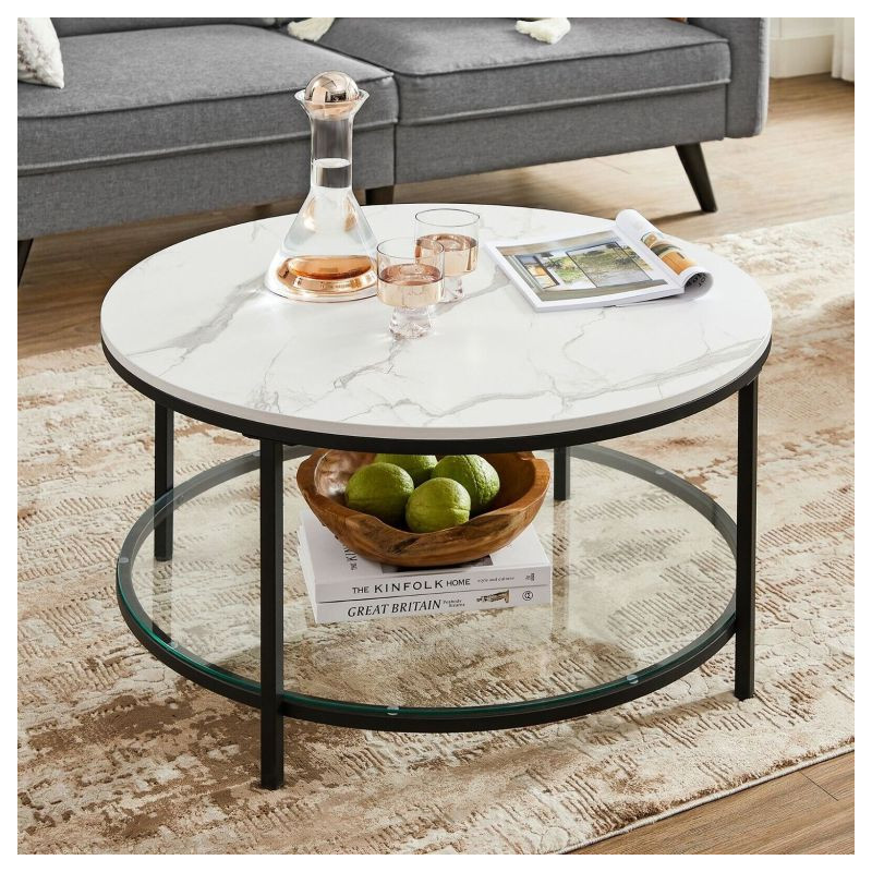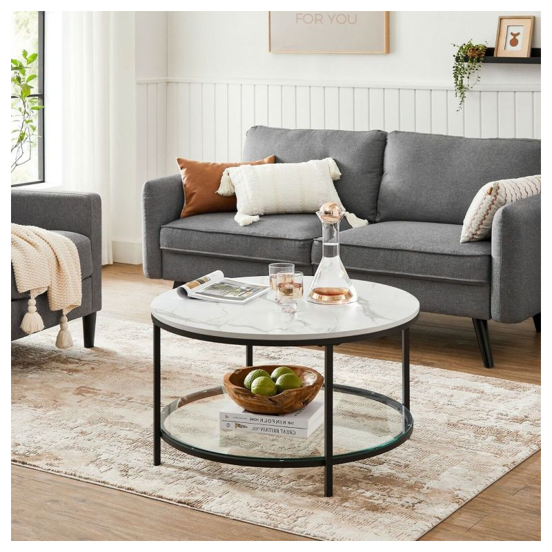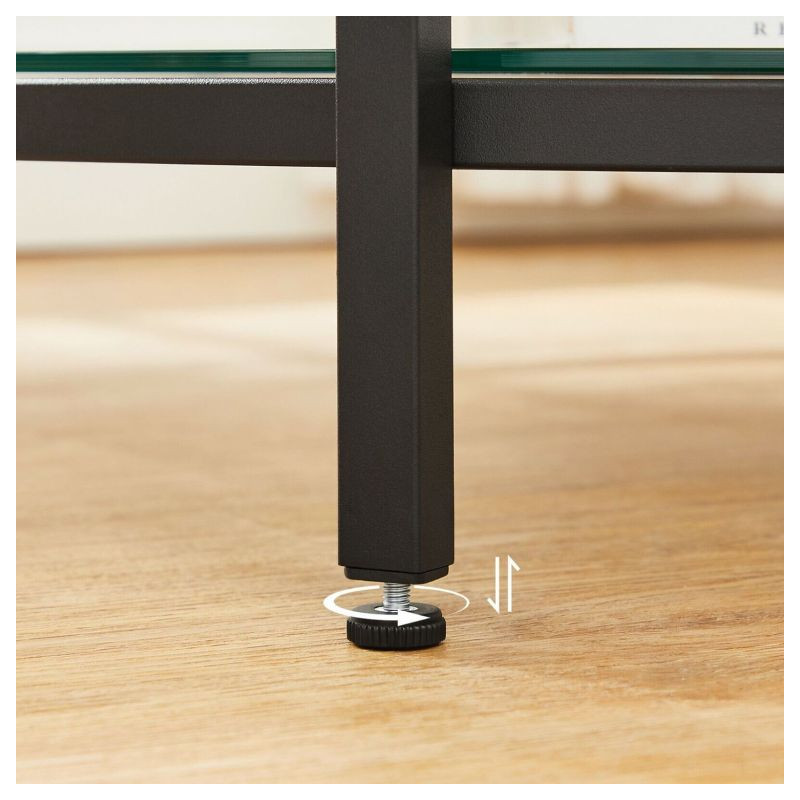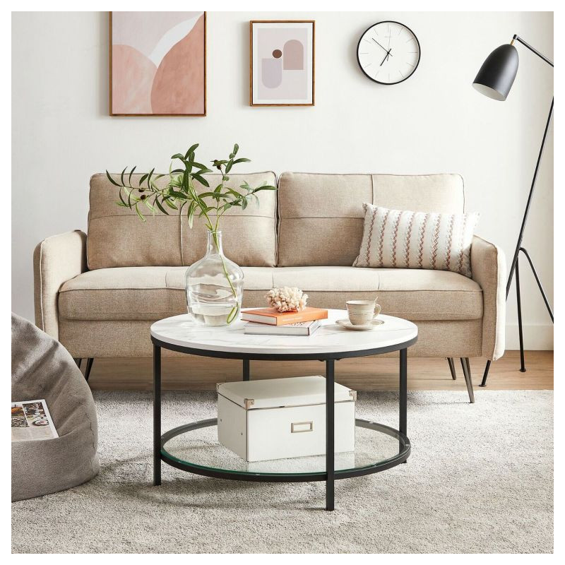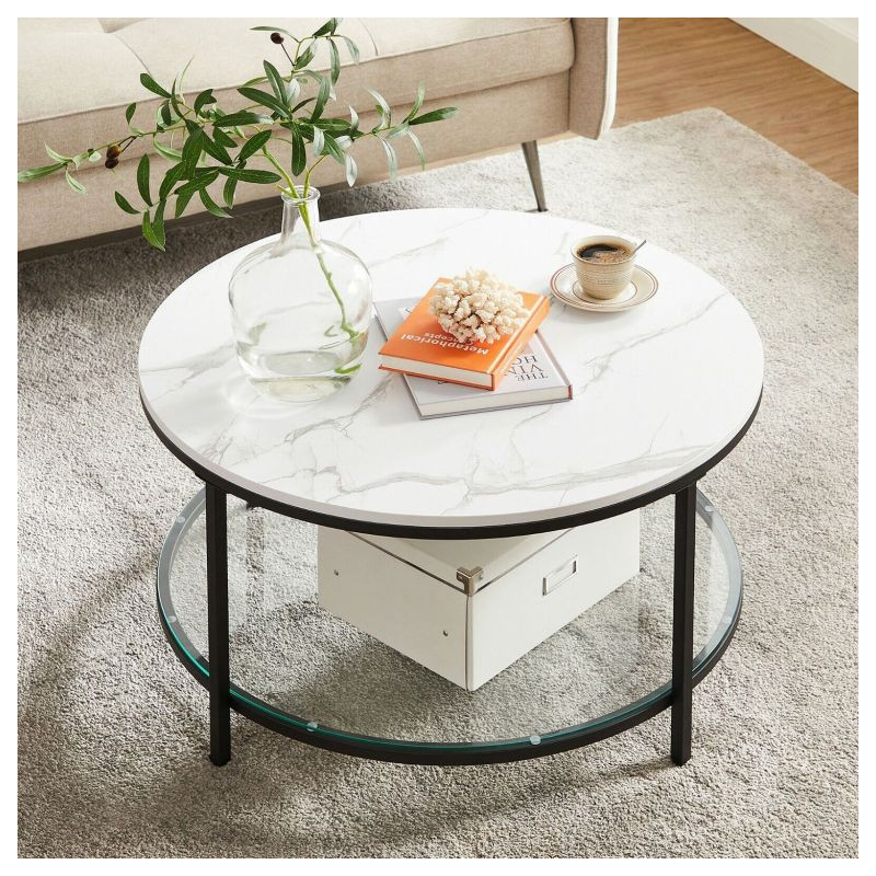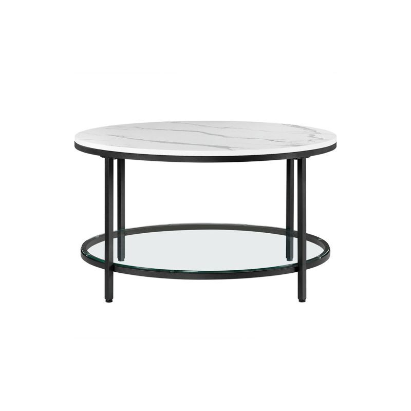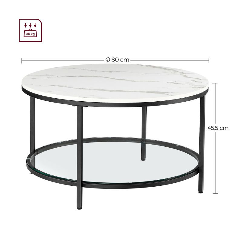 Dodajte svojej obývačke štýl a praktickosť s konferenčným stolíkom VASAGLE. Elegantný biely mramorový efekt v kombinácii s čiernym kovovým rámom a spodnou sklenenou policou vytvára harmonický celok, ktorý ľahko zapadne do moderného interiéru. Vďaka šikovnému úložnému priestoru pod doskou si užijete poriadok aj počas spoločných chvíľ s rodinou či priateľmi.