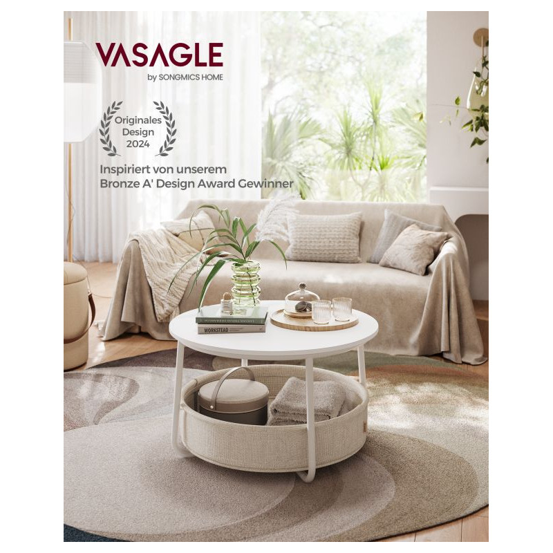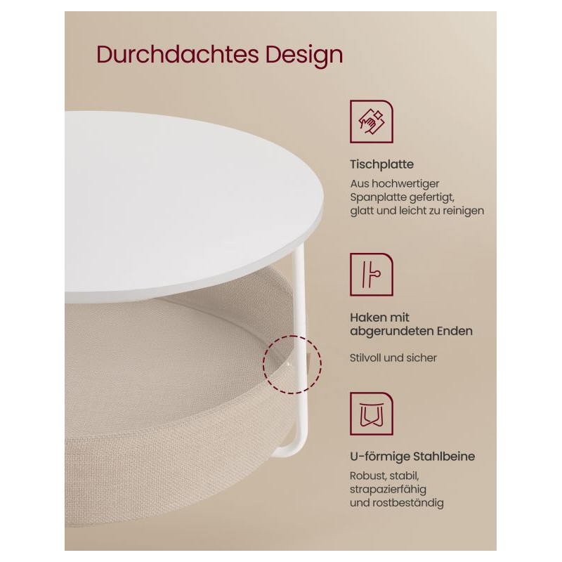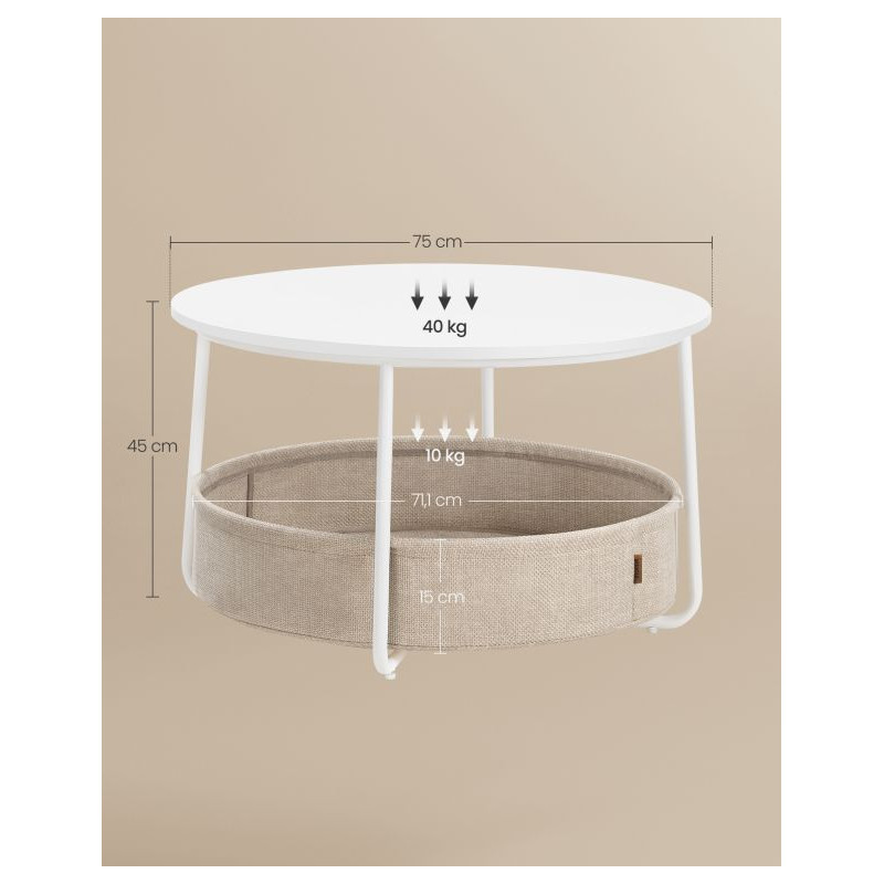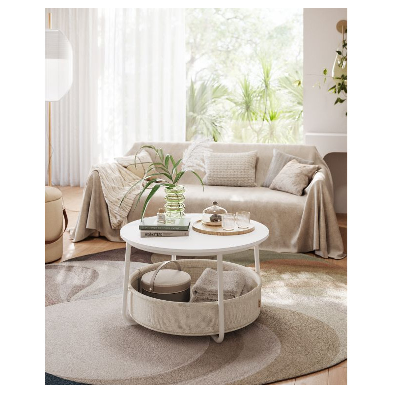 Dodajte svojej obývačke nádych modernej elegancie s týmto okrúhlym konferenčným stolíkom. Jeho minimalistický dizajn, kombinujúci matnú bielu povrchovú úpravu s hnedým látkovým košom, vytvára čistý, útulný a praktický vzhľad. Ponúka ideálny priestor na kávu, dekorácie alebo knihy a vďaka priestrannému úložnému košu budete mať vždy po ruke všetko, čo potrebujete.