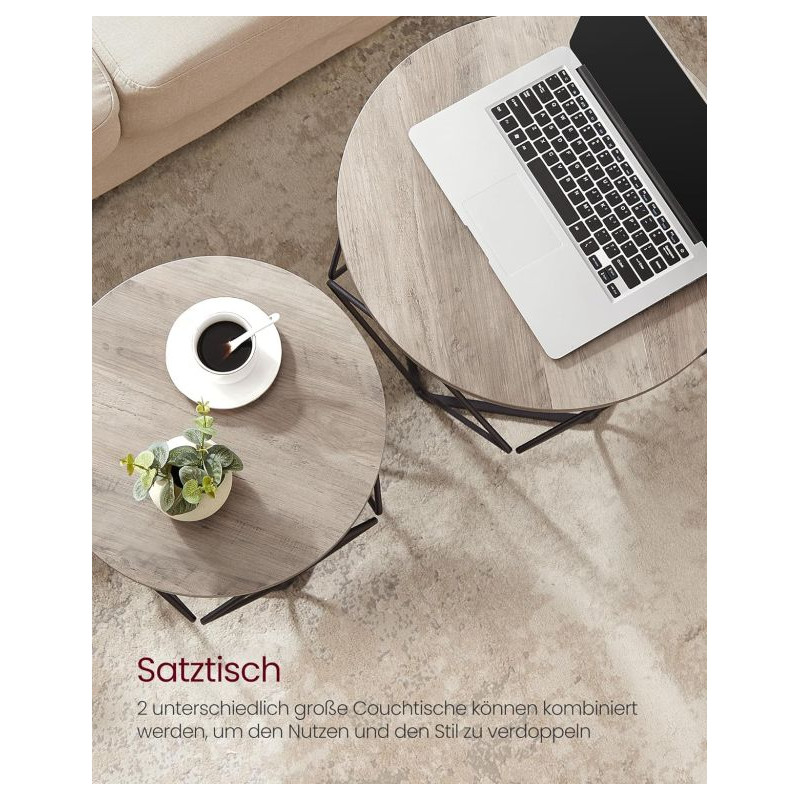 Oživte svoj interiér štýlovou sadou konferenčných stolíkov v industriálnom vintage štýle. Tieto okrúhle stolíky v kombinácii dreva a čiernej ocele dodajú vášmu domovu osobitý šmrnc a stanú sa stredobodom každej obývačky. Využijete ich na popoludňajšiu kávu, dekorácie alebo ako praktický odkladací priestor pre notebook.
