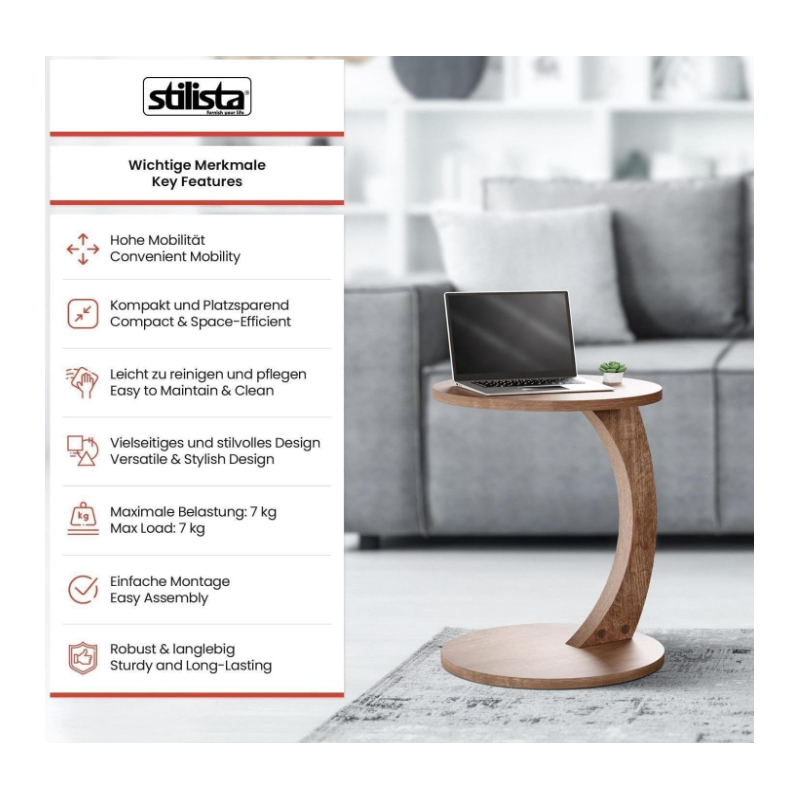 Stolík je vyrobený z kvalitného kompozitného dreva a jeho robustná konštrukcia zaručuje stabilitu až do 7 kg. Montáž zvládnete za pár minút vďaka priloženej sade, údržba je jednoduchá – stačí ho utrieť vlhkou handričkou.