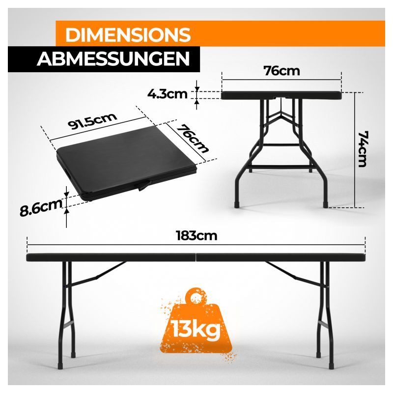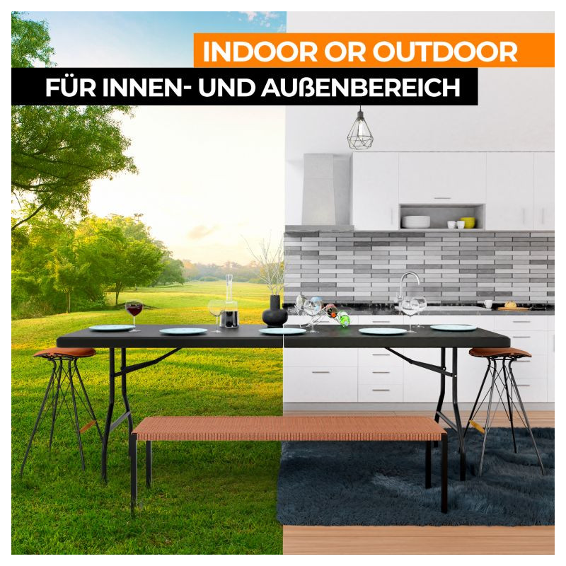 Vďaka perfektným rozmerom (183 x 76 x 74 cm) je možné bufetový stôl používať ako vonku, napríklad na záhrade, terase alebo v kempe, tak v interiéri, teda v kuchyni alebo obývačke. Vďaka integrovanému držadlu a nízkej hmotnosti si kompaktný skladací stôl môžete vziať kamkoľvek so sebou.