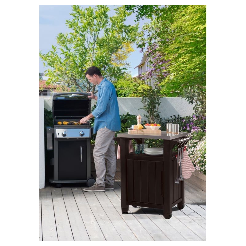 Mobilná skrinka, ktorú oceníte predovšetkým pri grilovaní! Priestranná skriňa s dvojitými dverami vybavená funkčnou nerezovou doskou a praktickou rukoväťou s háčikom na uteráky, ktorá bude dobre fungovať pri dôležitých rodinných stretnutiach na terase alebo na záhrade.