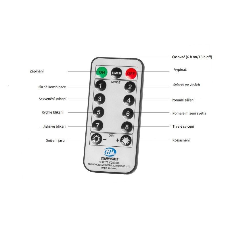 Súčasťou osvetlenia je aj diaľkové ovládanie, vďaka ktorému osvetlenie na diaľku nielen zapnete a vypnete, ale zároveň môžete nastaviť časovač (osvetlenie bude 6 hodín potom vždy svietiť a 18 hodín "spať") alebo využiť možnosť zvýšenia a zníženia jasu. Samozrejmosťou je tiež 8 svetelných funkcií: rôzne kombinácie, svietenie vo vlnách, sekvenčné svietenie, pomalá žiara, rýchle blikanie, pomalé slabnutie, iskrivé blikanie, stále svietenie.