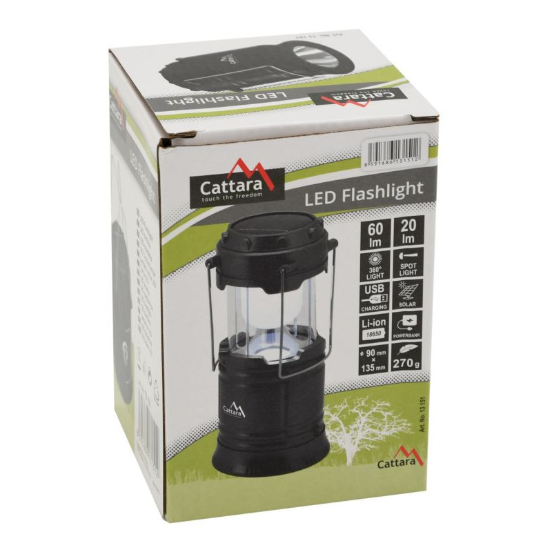Svietidlo je vybavené bodovou LED o svetelnom toku 20lm, ktorá v kombinácii s reflektorom a sklenenou šošovkou vydáva vysoký optický výkon. Svietidlo je ďalej vybavené ukrytým osvetlením s 6x LED o svetelnom toku 60lm, ktoré je ukryté vo vysúvacom tele a zaistí príjemné neoslňujúce osvetlenie. Svietenie čelného osvetlenia sa prepína vypínačom na bočnej strane tela a rozsvietenie ukrytého osvetlenia je riešené vysunutím tela svietidla. Napájanie je riešené pomocou Li-Ion aklumulátora 18650 s kapacitou 1200mAh uloženého v tele. Akumulátor je možné dobíjať pomocou priloženého USB kábla. Svietidlo sa tiež dobíja na svetle pomocou solárneho panelu na vrchnej strane zariadenia. Navyše je možné svietidlo použiť ako powerbanku a to pomocou bežnej USB zásuvky na boku zariadenia.