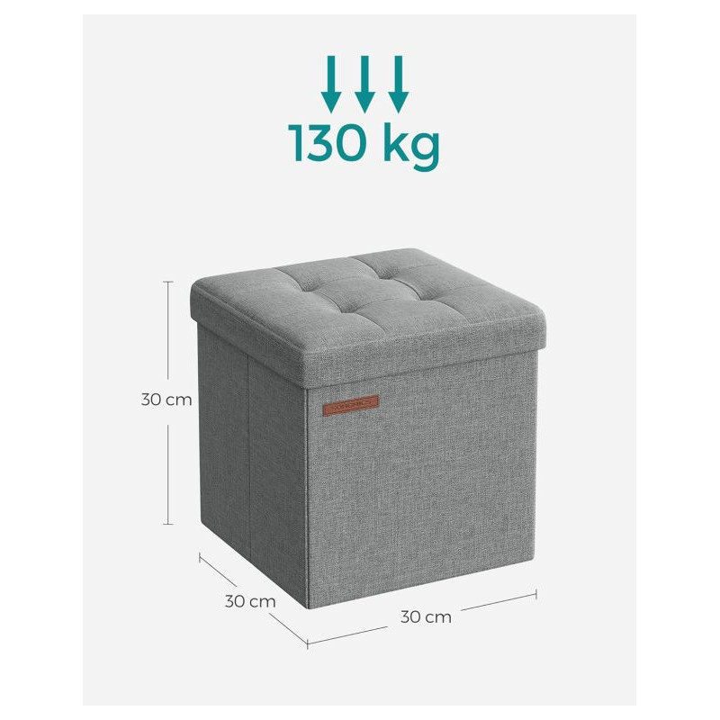 Masívna konštrukcia z MDF dosiek unesie až 130 kg, takže taburet poslúži nielen ako pohodlná stolička, ale aj ako podnožka alebo praktická odkladacia plocha. Vďaka skladaciemu systému ho behom pár sekúnd zložíte a ľahko uložíte. Jeho kompaktné rozmery 30×30×30 cm sa skvele hodia aj do menších priestorov.