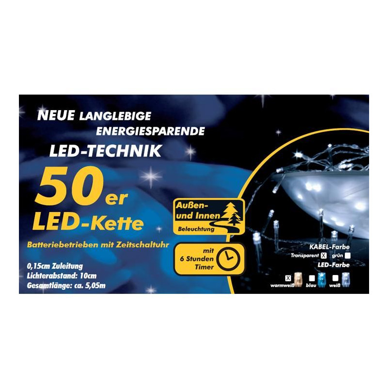Svetelná reťaz s 50 LED diódami a časovým spínačom je určená pre vonkajšie aj vnútorné použitie. Už nikdy nemeňte žiarovky! LED technika Vám to umožní. Jedna žiarovka konvenčných svetelných reťazí spotrebuje toľko energie, čo celá reťaz LED diód. LED diódy sú navyše odolné voči nárazom a nevytvárajú žiadne teplo.