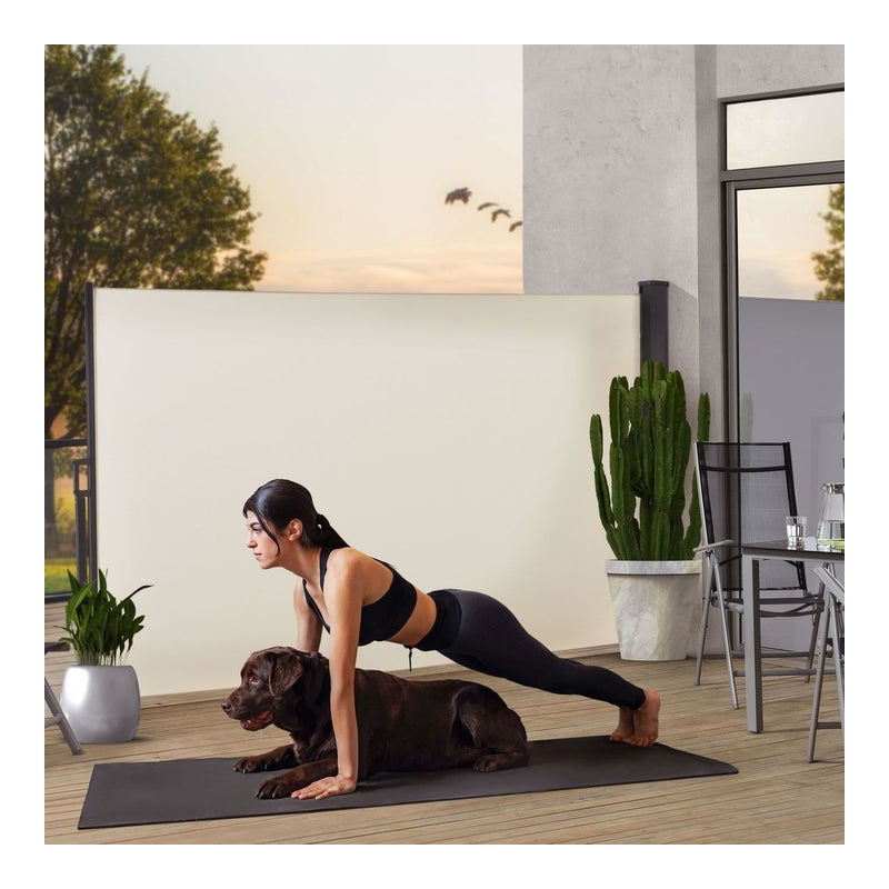 Vychutnajte si nerušené chvíle na terase alebo v záhrade s bočnou markízou v jemnej béžovej farbe. Ochráni vás pred slnkom, vetrom a zvedavými pohľadmi susedov a vytvorí príjemné prostredie na relaxáciu a posedenie s priateľmi.