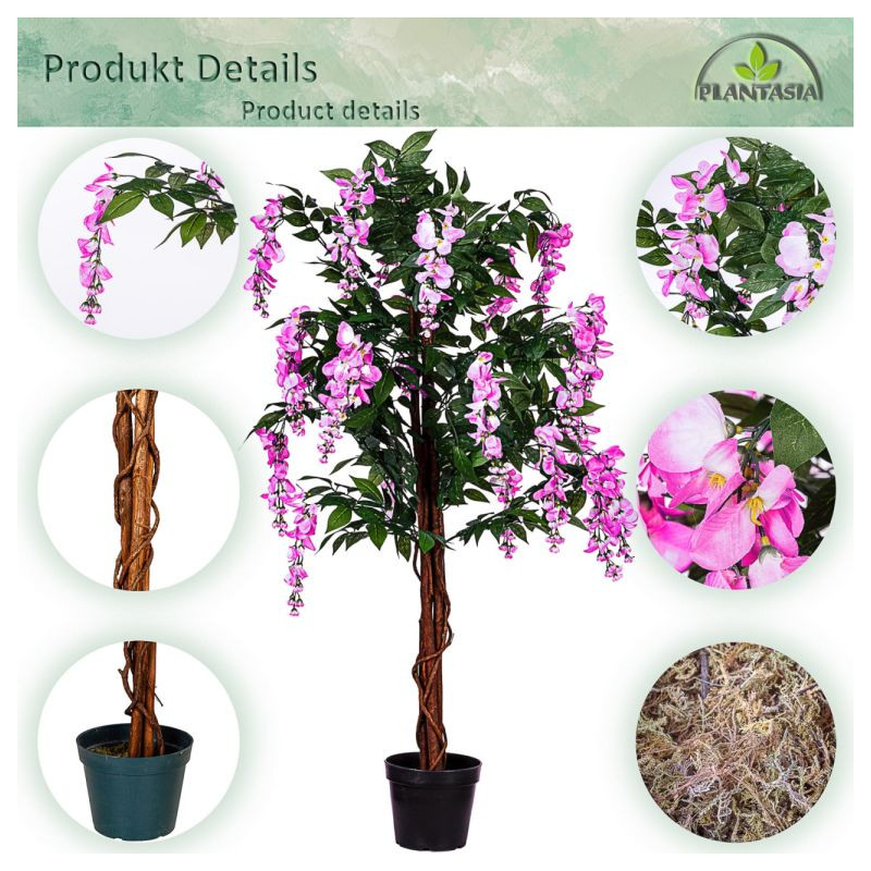 Umelý strom má autenticky zakorenený kmeň s približne 756 listami a 24 kvetnými cípmi. Vďaka detailne prepracovaným listom a kvetom vyzerá umelý stromček mimoriadne realisticky a od skutočného ho možno len ťažko rozoznať. Skutočný drevený kmeň z palmového dreva dotvára realistický vzhľad vistérie. Náš umelý stromček sa dodáva v čiernom kvetináči s Ø 18 x v 17 cm, ktorý je možné ľahko umiestniť do ozdobného kvetináča podľa Vášho výberu. Umelé rastliny nepotrebujú svetlo ani vodu a je možné ich použiť aj v miestnostiach, kam nemožno umiestniť skutočné rastliny.