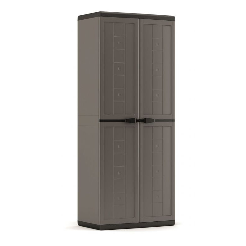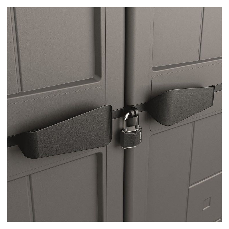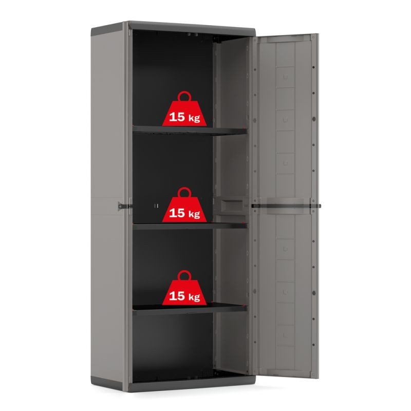 Výhodou skrine sú ľahko posúvateľné poličky aj prispôsobenie na visiaci zámok. Má jednoduchú montáž bez potreby náradia, je uzamykateľná na visiaci zámok (nie je súčasťou balenia). Poličky ľahko posuniete nahor alebo nadol podľa svojich potrieb.