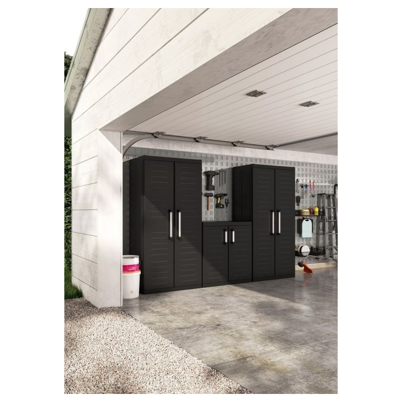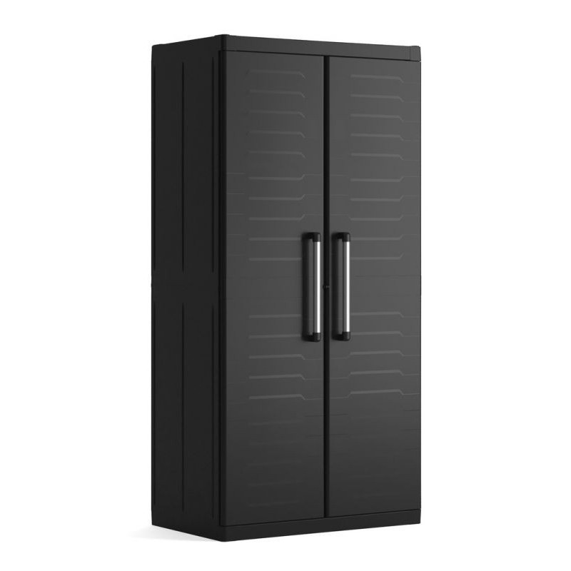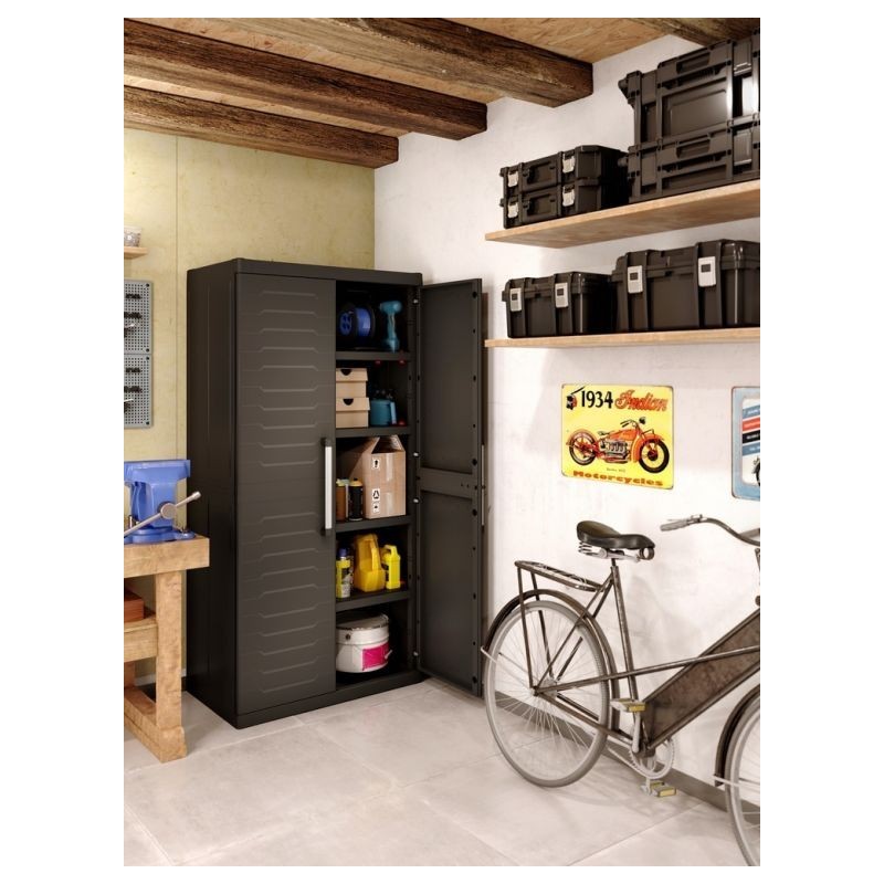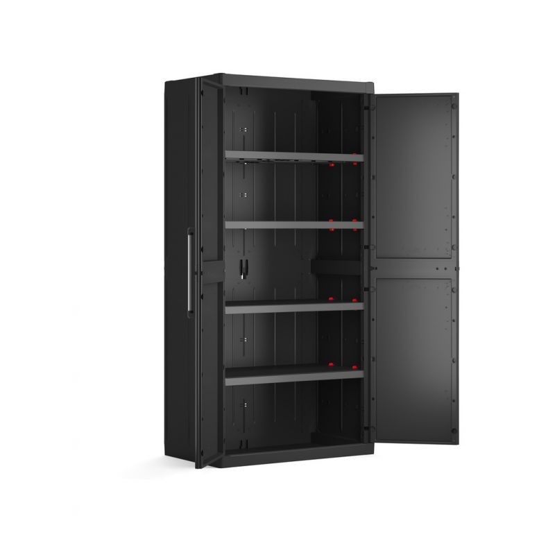 Plastová skriňa vyniká perfektným dizajnom, jednoduchou zostaviteľnosťou a širokou ponukou variant. Poskytuje posúvateľné police vďaka systému SLO, uzamykateľnosť na visiaci zámok, spojovateľnosť skríň medzi sebou a optimálne rukoväte. Police si ľahko prispôsobíte vďaka bezpečnostnej poistke SLO vybavenej pacičkami na visiaci zámok. 4 police s nosnosťou 25 kg, majú na spodnej strane žliabky na možné vloženie boxov. Vhodná do dielní, garáží, prevádzkových hál, ale aj na zastrešené terasy či do záhradných domčekov.