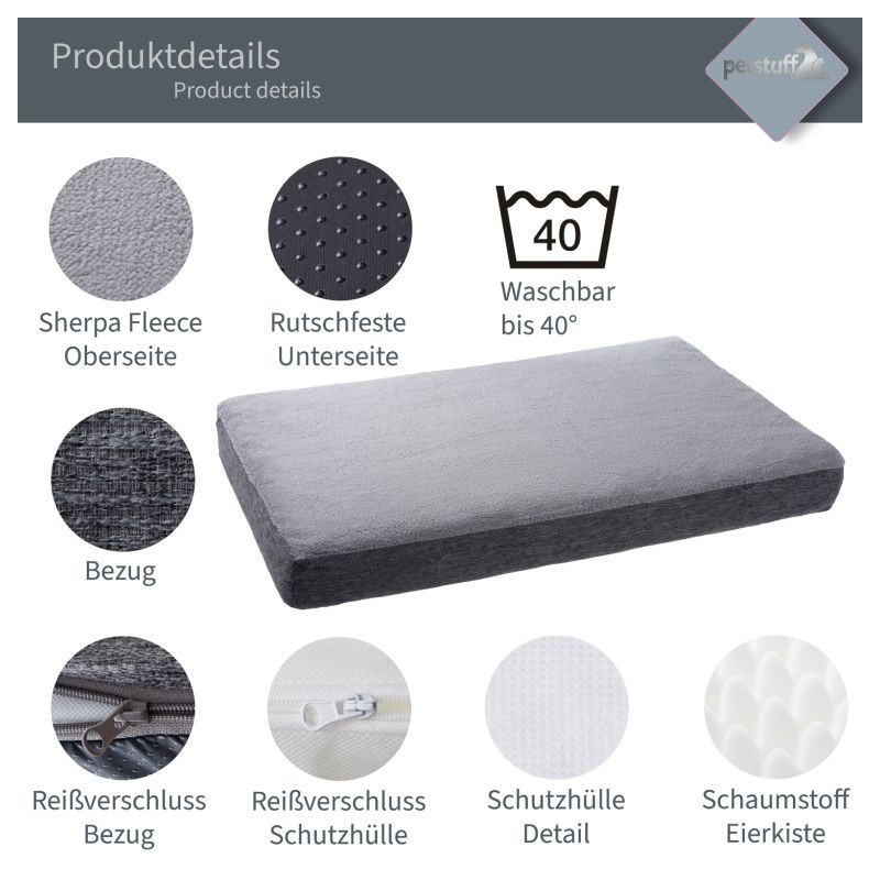 Pelech Petstuff je príjemné miesto na spanie pre Vášho psa, mačku alebo iných domácich miláčikov. Náš pelech je vhodný aj ako doplnok do búdy, klietky alebo prepravného boxu. Na vankúši je váha rovnomerne rozložená a tlmí nárazy, čo je nielen pohodlné, ale chráni tak aj kĺby zvieraťa. Zips umožňuje jednoducho zložiť poťah a vyprať ho v ruke alebo na nízkej teplote. Vodoodpudivá vnútorná fólia navyše chráni penu pred nečistotami. Spodná strana vankúša má robustný materiál, vďaka prídavným protišmykovým nopom je znížené kĺzanie.