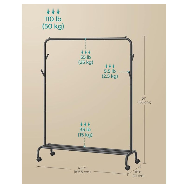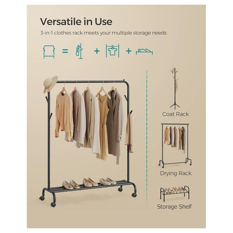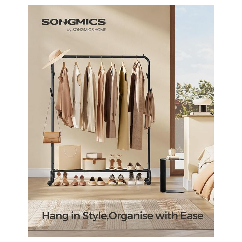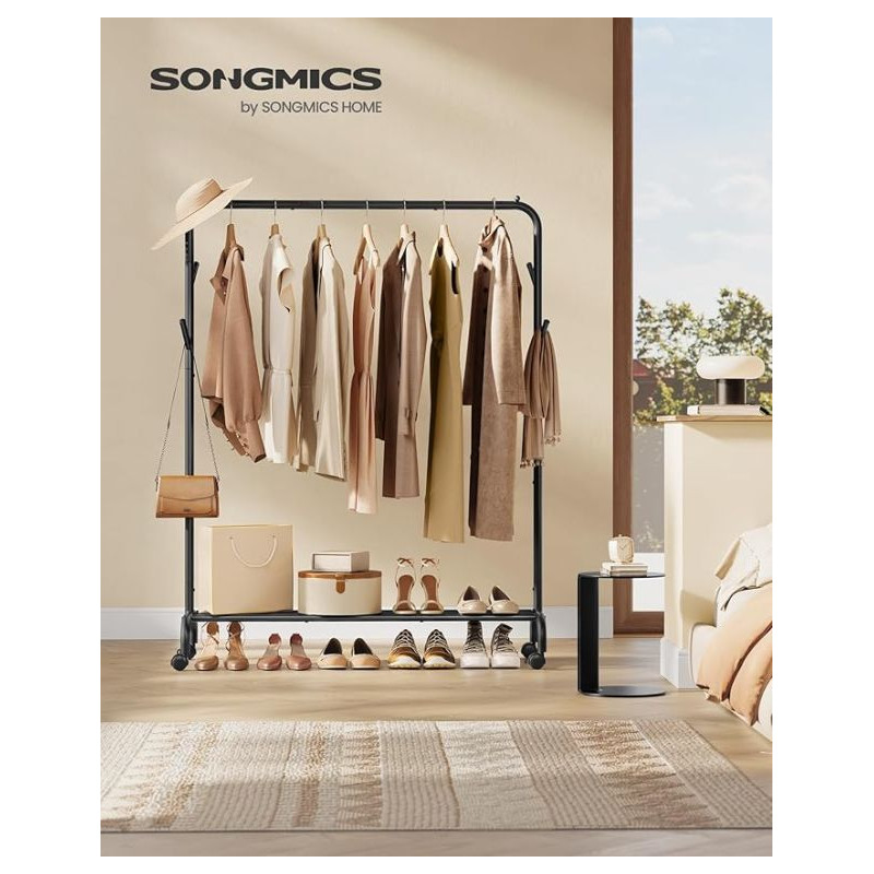 Potrebujete mať svoje oblečenie vždy po ruke a pekne usporiadané? Tento štýlový kovový vešiak v čiernej farbe ponúka elegantné riešenie pre vašu spálňu, predsieň alebo práčovňu. Vďaka svojej pevnej konštrukcii unesie až 50 kg a kolieska uľahčujú jeho presúvanie tam, kde ho práve potrebujete.