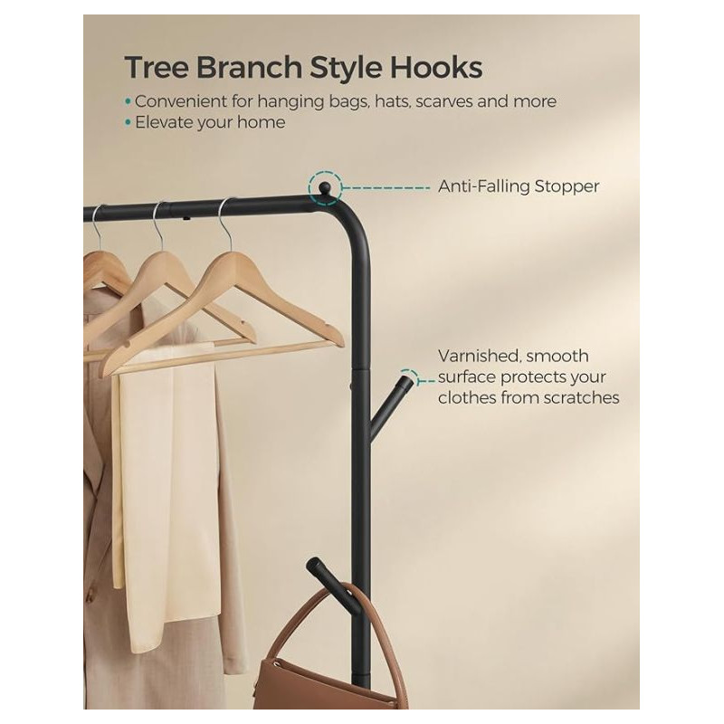 Robustná oceľová konštrukcia, bočné háčiky na príslušenstvo a spodná polica na topánky alebo krabice robia z tohto stojana nepostrádateľný doplnok do domácnosti. Je ideálny pre mužov, ktorí hľadajú kombináciu odolnosti, funkčnosti a jednoduchého dizajnu. Vďaka jasným pokynom a označeným dielom ho môžete zmontovať za pár minút.