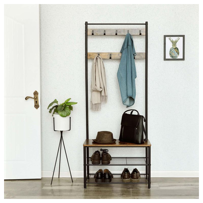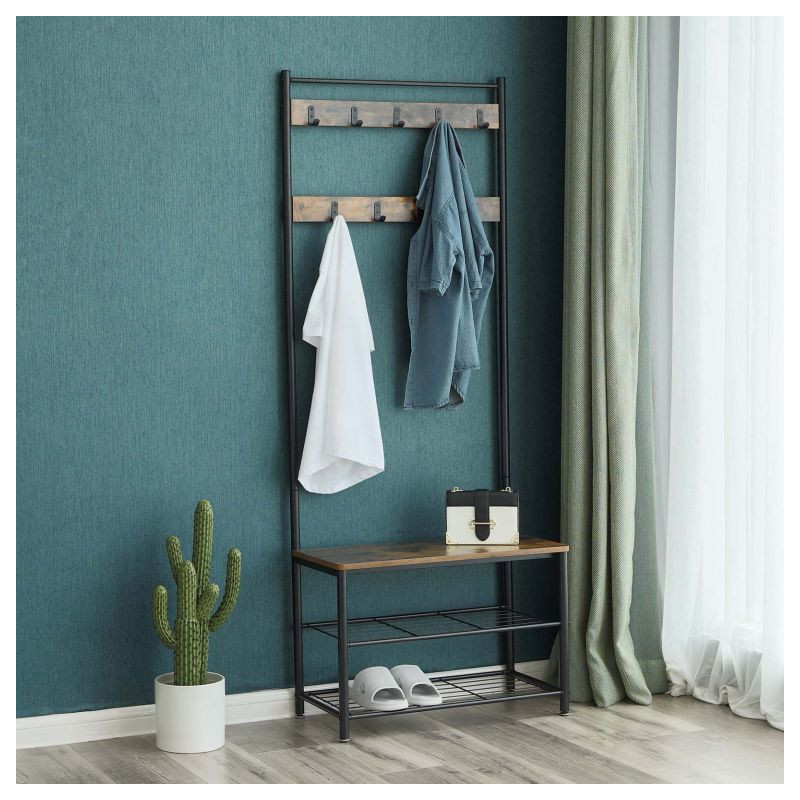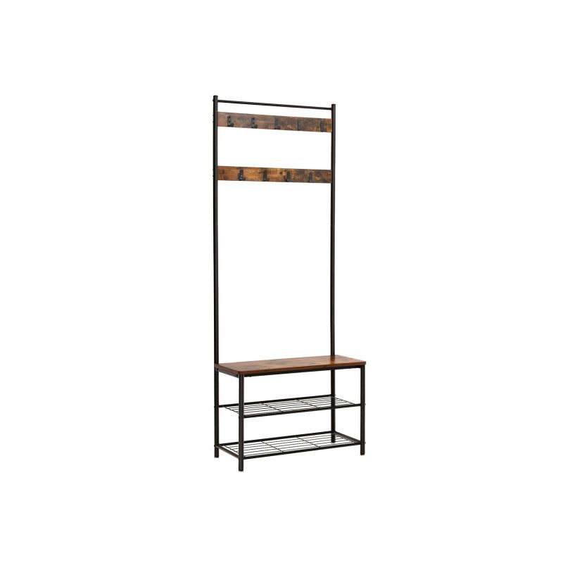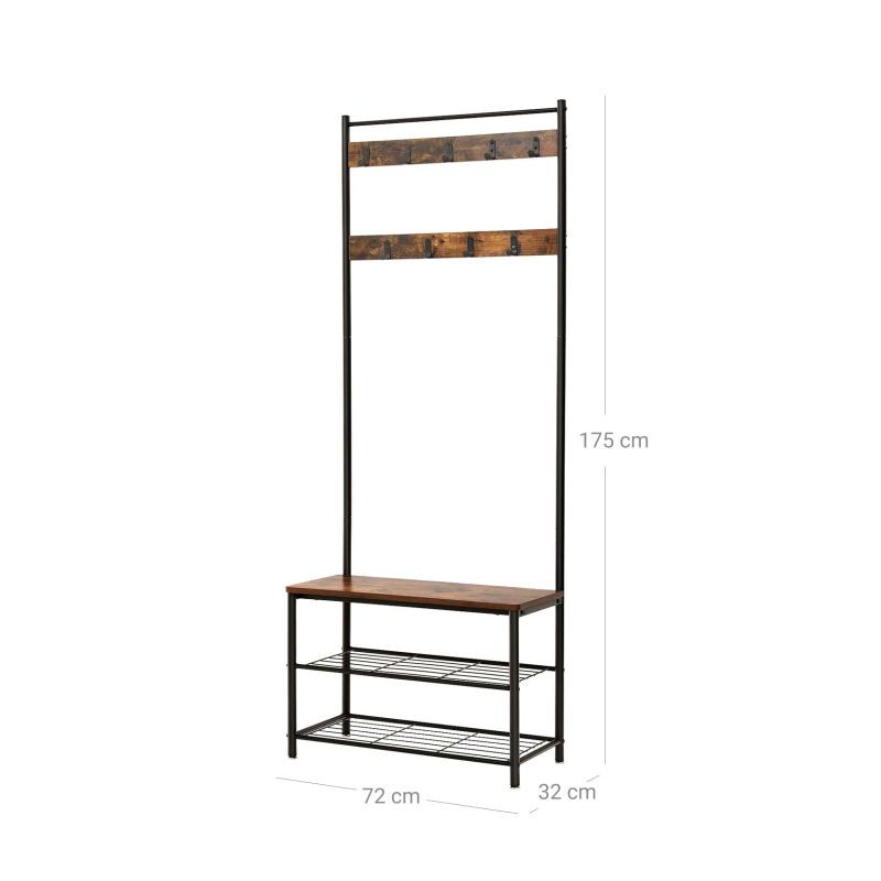 Vytvorte útulný a organizovaný vstup do svojho domova s týmto štýlovým vešiakom 3 v 1. Praktická lavica, deväť háčikov a dve police na topánky vám uľahčia každodenné dochádzanie do práce a návrat domov. Rustikálny dizajn dodá vašej predsieni charakteristický vzhľad a privíta každého návštevníka.