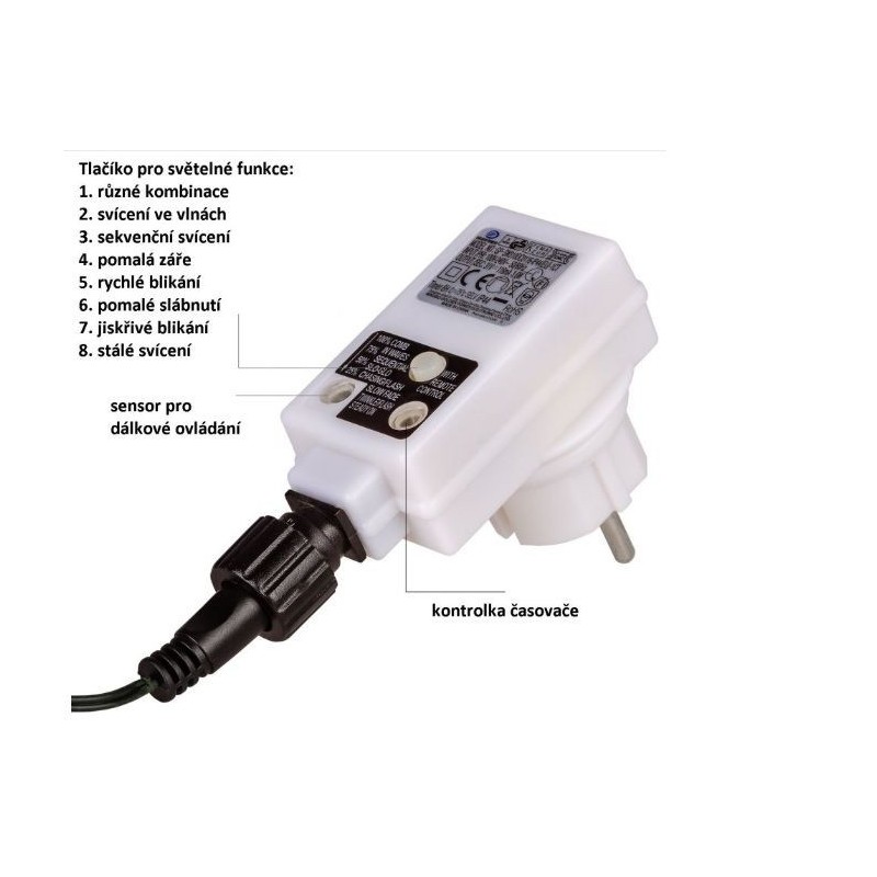 Svetelná reťaz je vhodná pre vnútorné i vonkajšie použitie - na okno alebo do chodby, ale aj na dom či stromček. Osvetlenie nie je výhradne určené pre dobu Vianoc, ale môžete ho využiť aj na osvetlenie Vášho stanu či záhrady počas letných mesiacov. LED diódy sú obľúbenou náhradou za klasické žiarovky. Oproti klasickým žiarovkám LED diódy nevyžarujú teplo, sú odolné proti otrasom a môžete vďaka nim ušetriť až 90 % energie, ktorú by ste inak spotrebovali na klasické žiarovky. Priemerná životnosť LED diódy je 2 000 hodín svietenia (normálna žiarovka cca 1 000 hodín v závislosti na svietivosti). LED reťaz spĺňa nemecké normy, je na ňu vystavený certifikát bezpečnosti GS a spĺňa stupeň krytia IP 44 (pre vonkajšie použitie). Súčasťou osvetlenia je aj diaľkové ovládanie, vďaka ktorému osvetlenie na diaľku nielen zapnete a vypnete. Zároveň môžete nastaviť časovač (osvetlenie bude 6 hodín potom vždy svietiť a 18 hodín "spať") alebo využiť možnosť zvýšenia alebo zníženia jasu. Samozrejmosťou je tiež 8 svetelných funkcií: rôzne kombinácie, svietenie vo vlnách, sekvenčné svietenie, pomalá žiara, rýchle blikanie, pomalé slabnutie, iskrivé blikanie, stále svietenie.