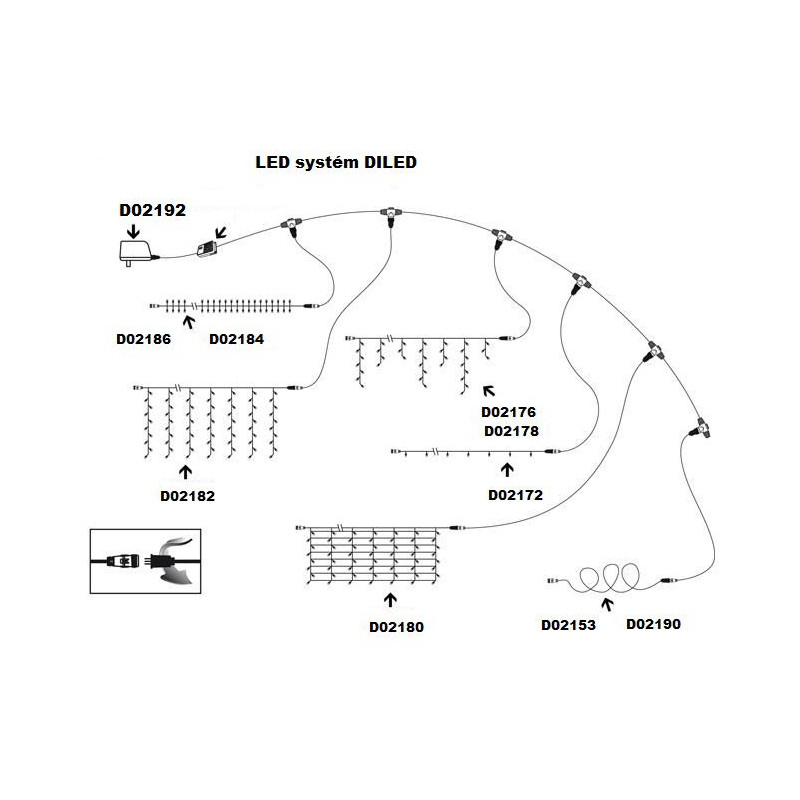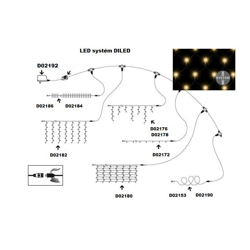 Reťaz je vhodná pre použitie v interiéri aj v exteriéri. Na jeden napájací adaptér môžete napojiť až 2 000 diód v rámci diLED systému.