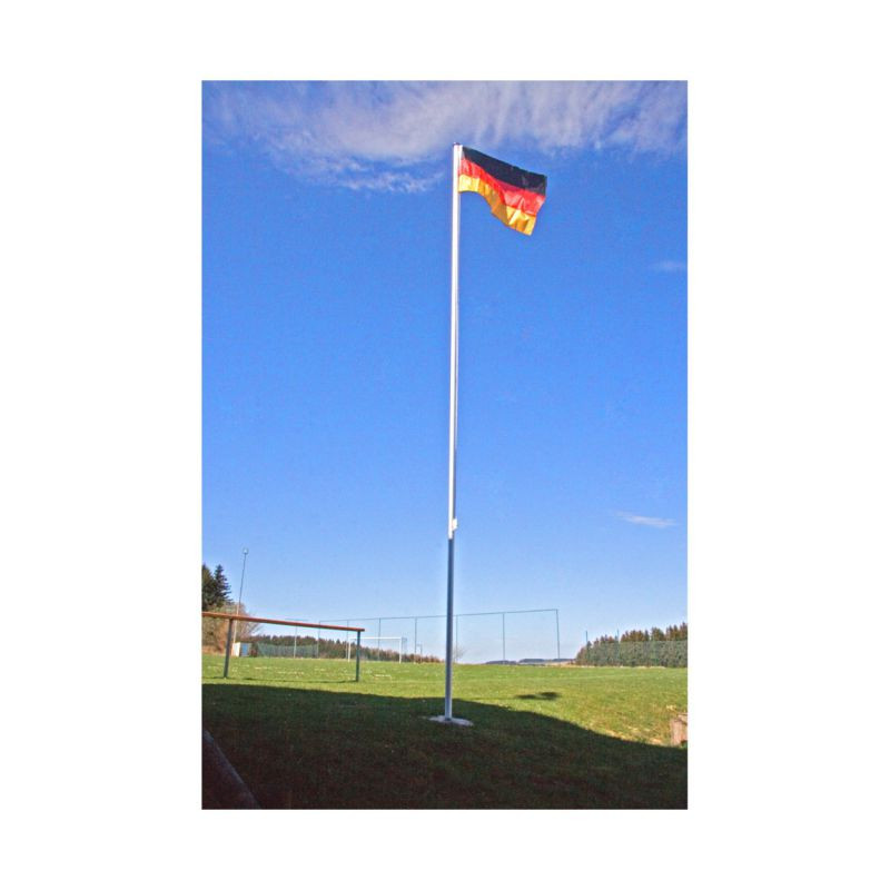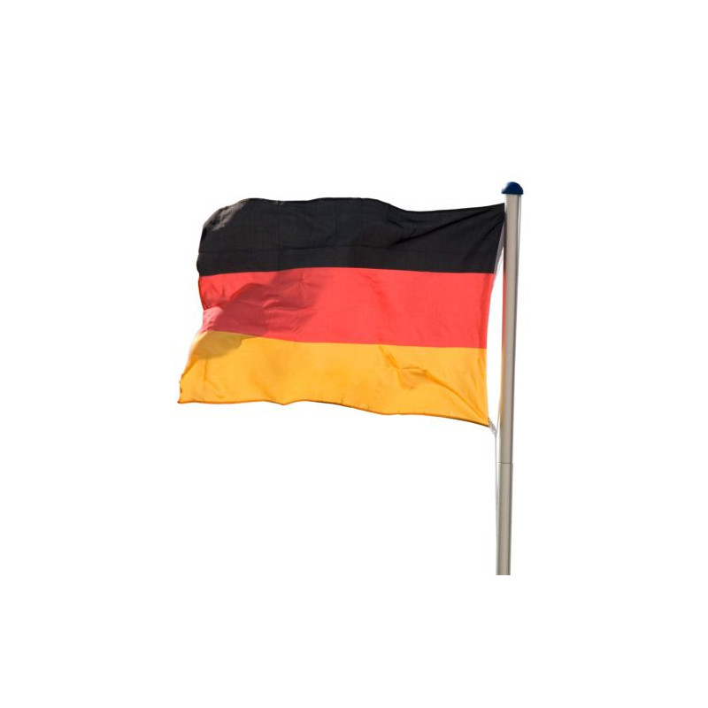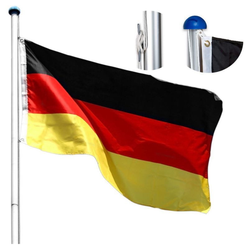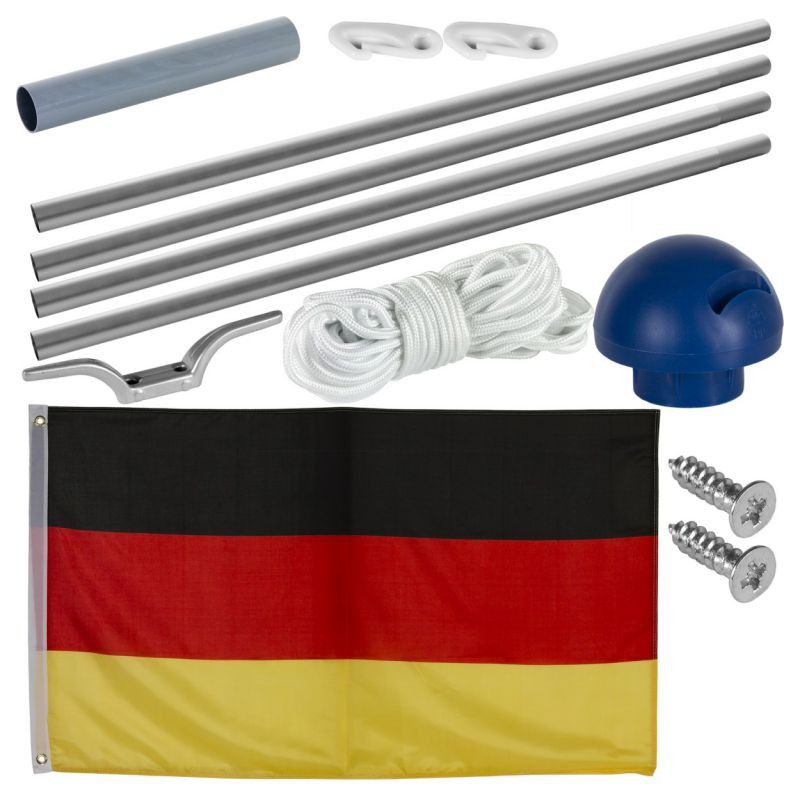 Hliníkový stožiar 6,5 m s nemeckou vlajkou. Stožiar na vlajku sa skladá zo 4 dielov a jeho montáž je veľmi jednoduchá. Jednotlivé časti do seba jednoducho zastrčíte a vsadíte do podstavca, ktorý je vhodný aj na zabetónovanie do zeme. Celková výška vrátane podstavca je 650 cm. Výška stožiaru je ľubovoľne nastaviteľná do piatich stupňov: 210, 310 cm, 410 cm, 510 cm cm alebo 610 cm. Súčasťou balenia je aj nemecká vlajka a zariadenie na vztýčenie vlajky.