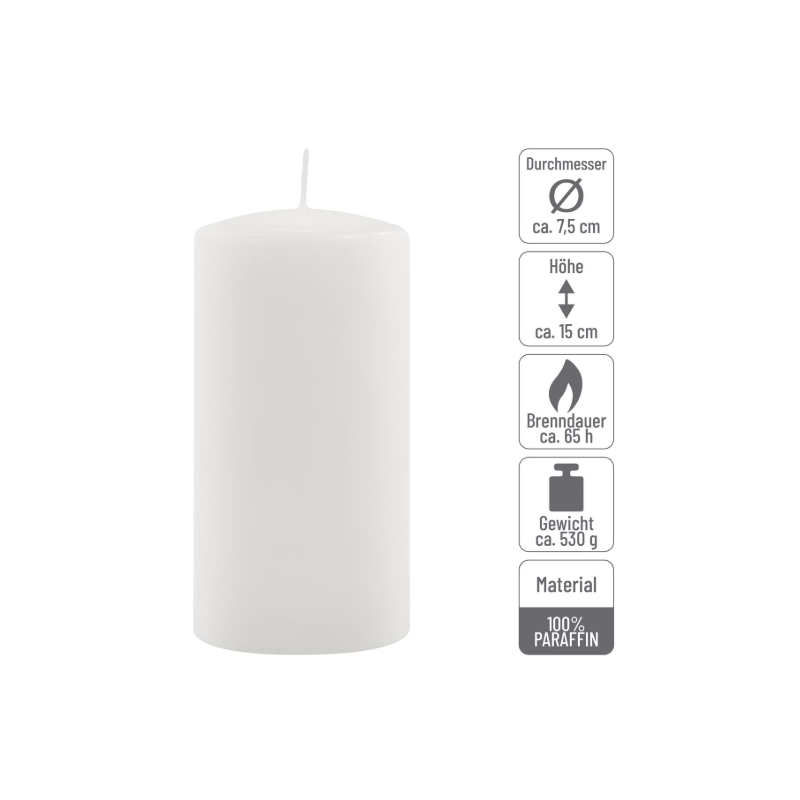 Súprava obsahuje dve vysoko kvalitné sviečky zo 100 % parafínu, každá s výškou 15 cm a priemerom 7,5 cm. Horia rovnomerne a bezpečne, bez parfumácie, s dobou horenia cca 65 hodín na kus. Tieto pevné sviečky sa ľahko umiestňujú do akéhokoľvek žiaruvzdorného svietnika a sú ideálne na praktické aj dekoratívne použitie.