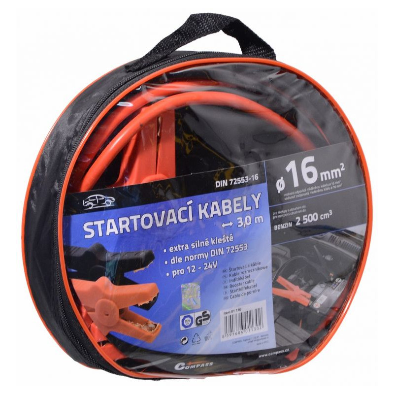 Tieto štartovacie káble sú určené na núdzové štartovanie vozidiel s benzínovým motorom do objemu 2500 cm3. Dĺžka 3 metre, vodivosťou zodpovedá medenému káblu s priemerom 16 mm2. Vysoko kvalitné štartovacie káble zodpovedajú požiadavkám európskej normy DIN 72553-16 a sú oprávnené na napätie od 12 V do 24 V. Káble sú vyrobené z medí potiahnutých hliníkových káblov, ktoré sú izolované a vybavené kompletne izolovanými kliešťami na pripojenie k akumulátoru. Pomocou štartovacích káblov je možné naštartovať vozidlo s vybitou batériou pripojením k vozidlu s nabitou batériou. Spájané môžu byť iba batérie s rovnakým napätím ( 12 V alebo 24 V ) a približne rovnakou kapacitou (Ah).