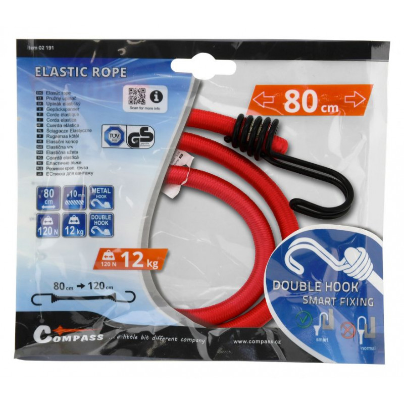 Vysoko kvalitný pružný upínač s homologizáciou TÜV/GS, zakončený dvojitými kovovými hákmi Smart Fixing. Tento pružný upínač sa môže pochváliť extra pevným jadrom s prierezom s priemerom 10 mm, zakončený zdvojenými, kovovými hákmi SMART FIXING, ktoré sa vyznačujú tvarom uľahčujúcim zachytenie na miestach, kde klasické háky nie je možné zaháknuť. Balenie obsahuje jeden upínač dĺžky 80 cm, ktorý ponúka pevnosť v ťahu 120 N a pretiahnutie až o polovicu svojej dĺžky až do 120 cm.