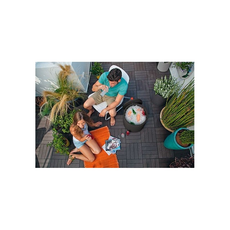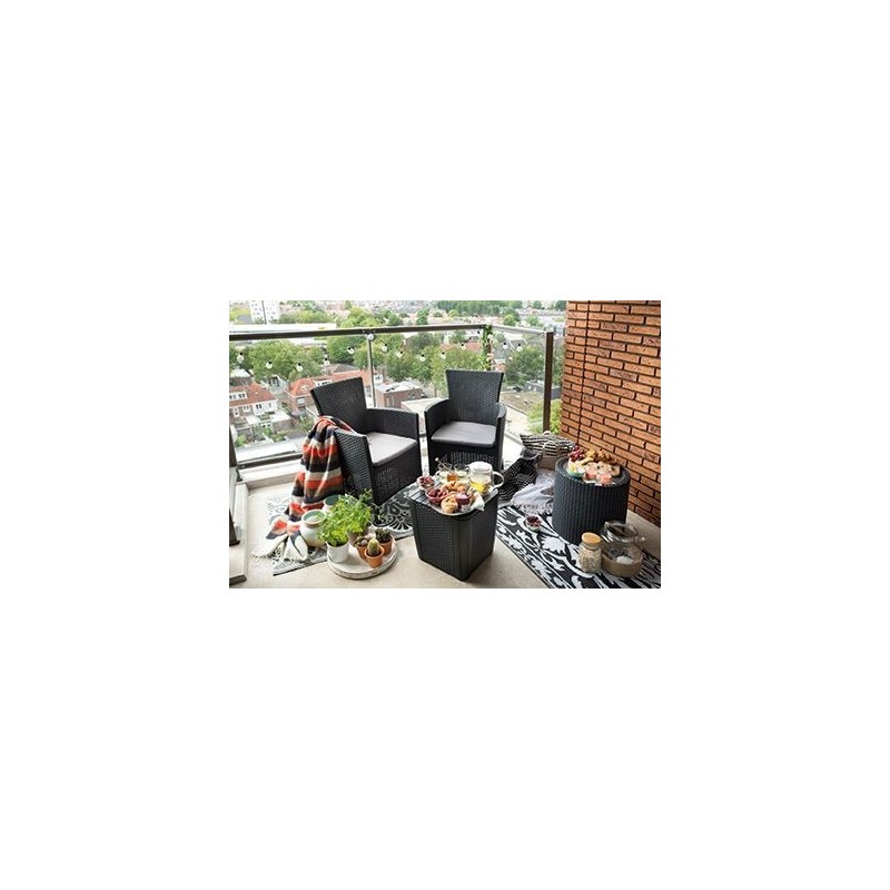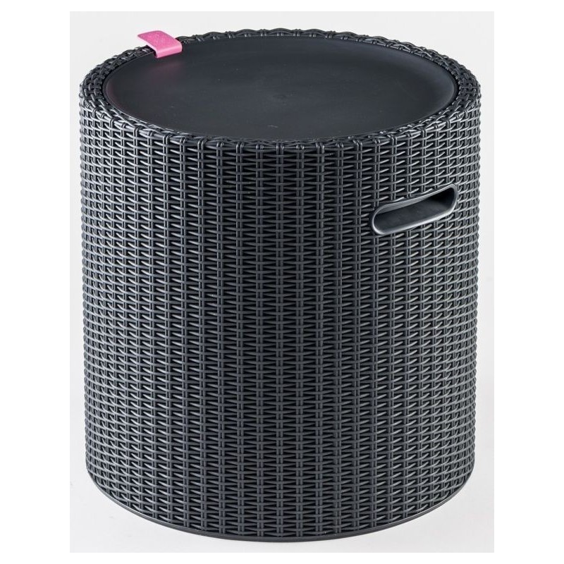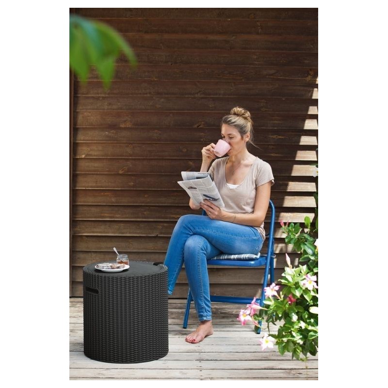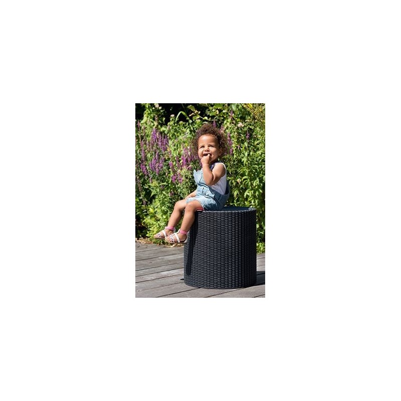 COOL STOOL je veľmi praktický a šikovný stolík s doplnkovými úložnými funkciami. Stolík je vyrobený z lisovaného plastu v imitácii prírodného ratanu. Po umiestnení vankúša na veko produktu bude fungovať ako sedadlo. Odolný voči nepriaznivým poveternostným vplyvom a UV žiareniu, ľahko sa udržuje v čistote.