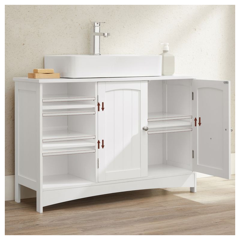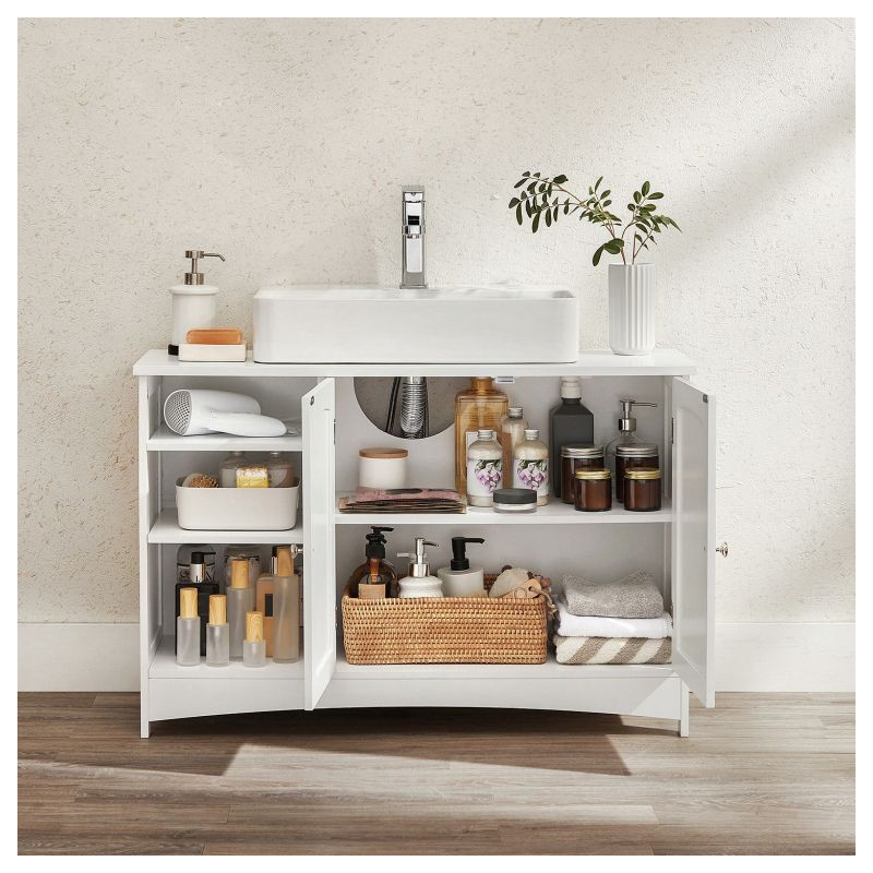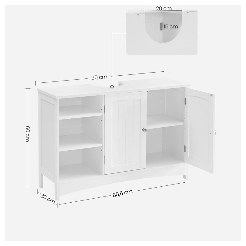 Vnesiete sviežosť a poriadok do vašej kúpeľne s touto štýlovou umývadlovou skrinkou. Biela povrchová úprava, elegantné dvierka s drážkami a chrómové úchytky dodávajú vašej kúpeľni moderný vzhľad a pocit čistoty. Otvorené a uzavreté police vám umožňujú mať všetko, čo potrebujete, po ruke alebo diskrétne uložené.