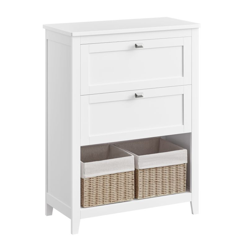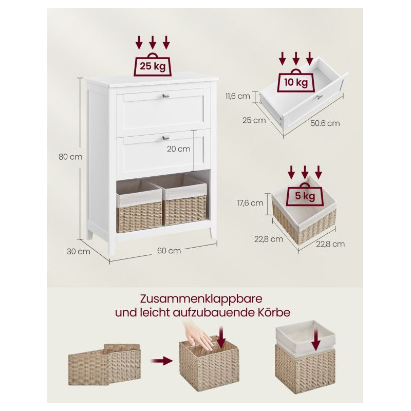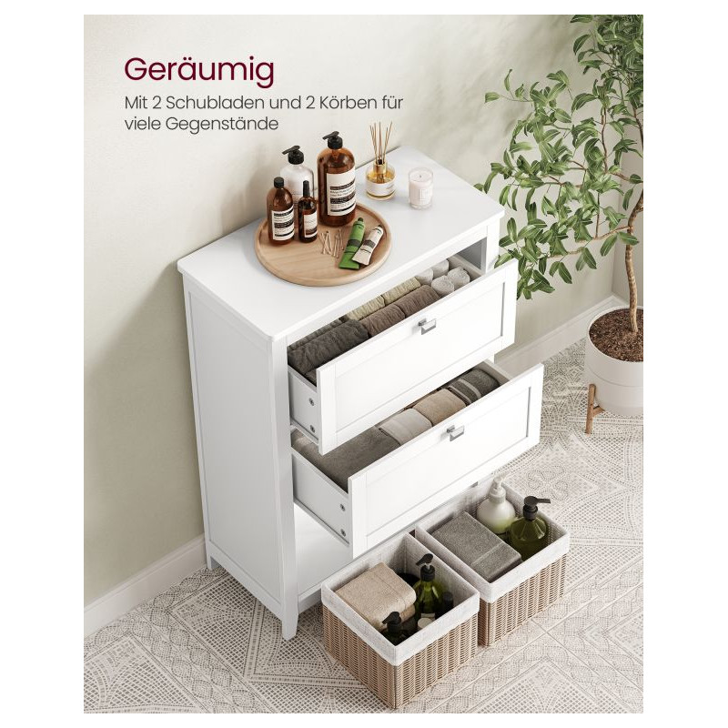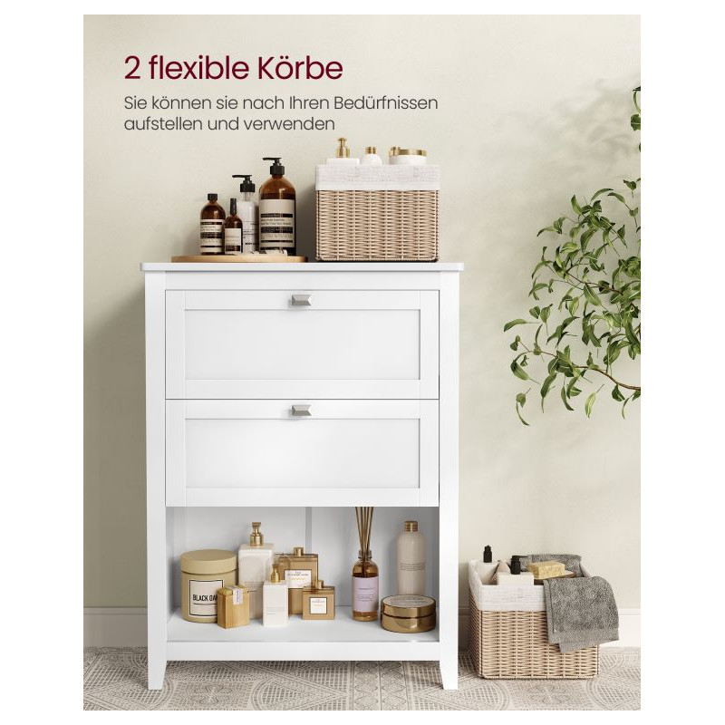 Vnesiete do svojej kúpeľne sviežu eleganciu a poriadok s touto štýlovou skriňou v bielej farbe. Dve priestranné zásuvky, otvorený priestor a dva koše z umelého ratanu vám umožnia mať všetko, čo potrebujete, na dosah ruky. Skrinka je ideálna nielen do kúpeľne, ale aj do predsiene alebo spálne – skrátka všade tam, kde potrebujete viac úložného priestoru.