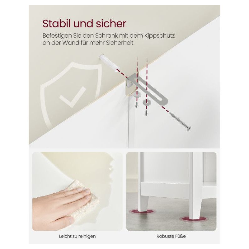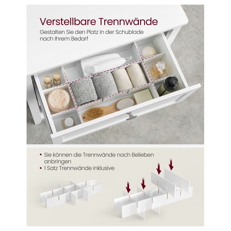 Robustná konštrukcia z MDF dosiek zaručuje dlhú životnosť a jednoduchú údržbu. Nastaviteľné priečky v zásuvkách vám umožňujú prispôsobiť vnútorný priestor vašim potrebám. Vďaka súprave proti prevráteniu je skrinka bezpečná aj v domácnostiach s deťmi. Koše sa dajú ľahko vybrať a používať samostatne.