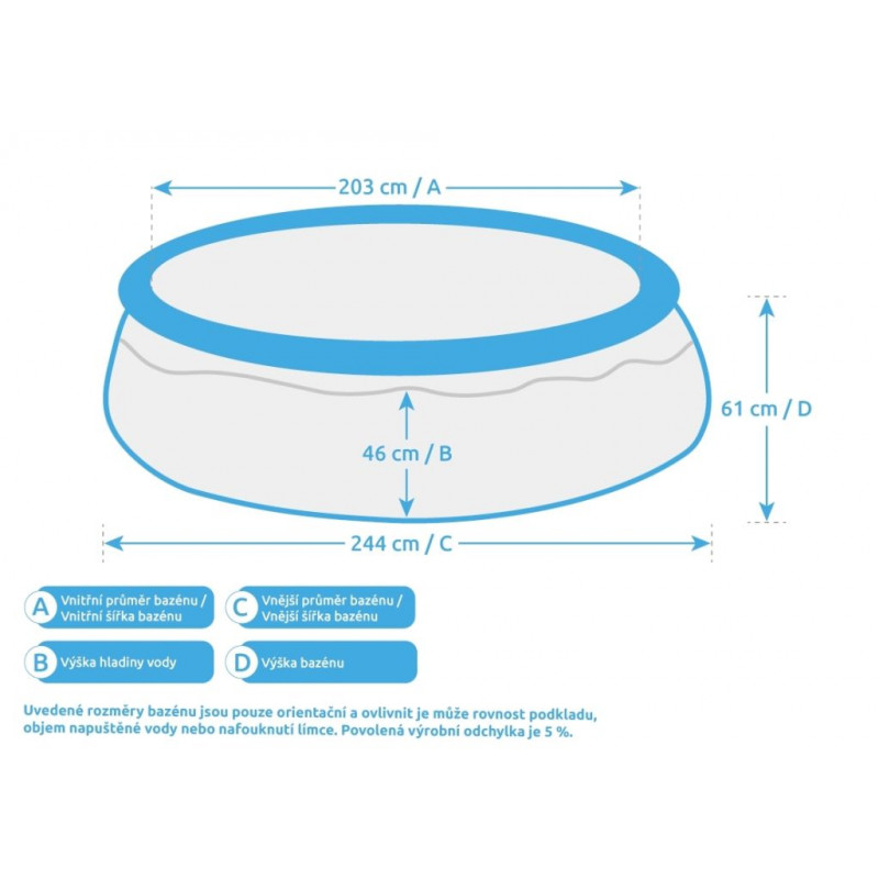Uvedené rozmery bazéna sú iba orientačné a ovplyvniť ich môže rovnosť podkladu, objem napustenej vody alebo nafúknutie goliera. Povolená výrobná odchýlka je 5 %.