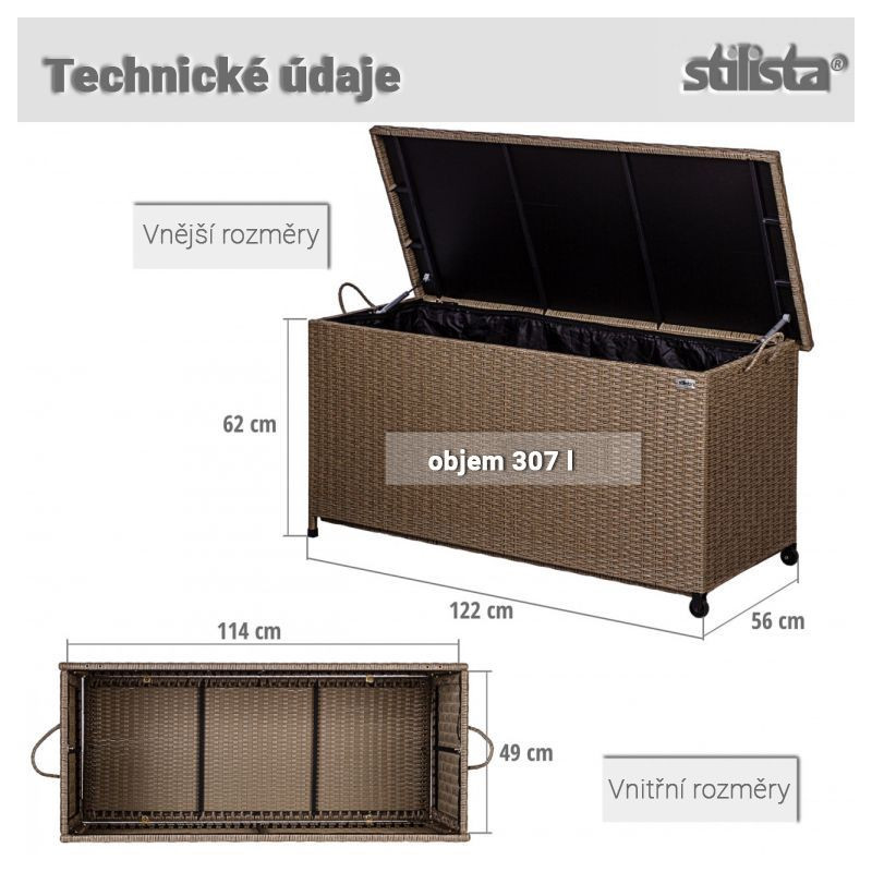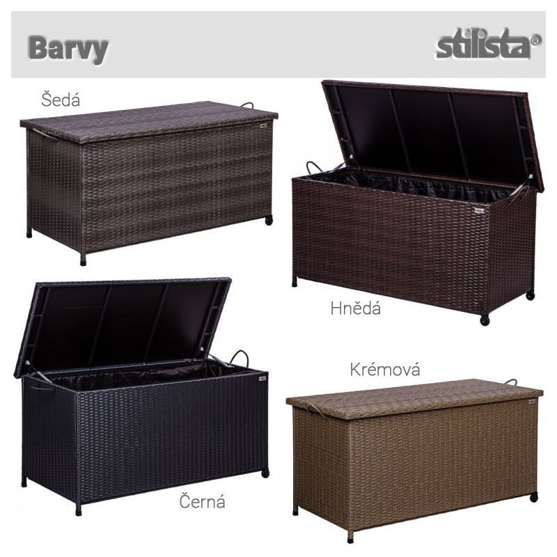 Polyratanový box na vankúše je vybavený dvomi úchytmi a dvomi kolieskami, takže sa s ním ľahko manipuluje. Záhradný box STILISTA má vodoodpudivú a odnímateľnú vnútornú plachtu z polyesteru. Náš záhradný box na vankúše je ideálny ako truhla na rôzne veci, sedáky alebo záhradné náčinie. Vďaka automatickému zdvíhaciemu mechanizmu zostáva veko spoľahlivo na mieste, a preto sa ľahko otvára.