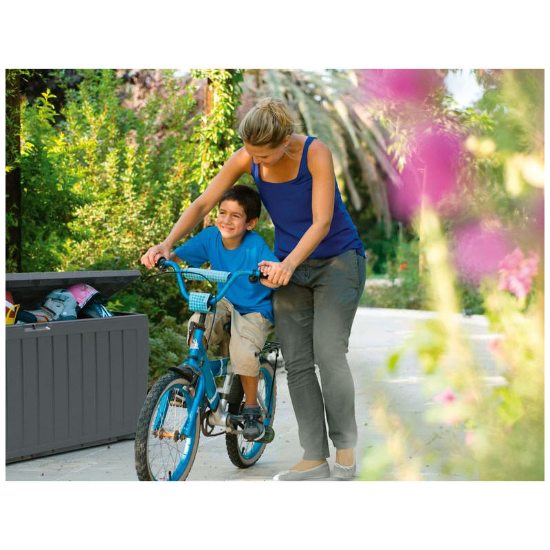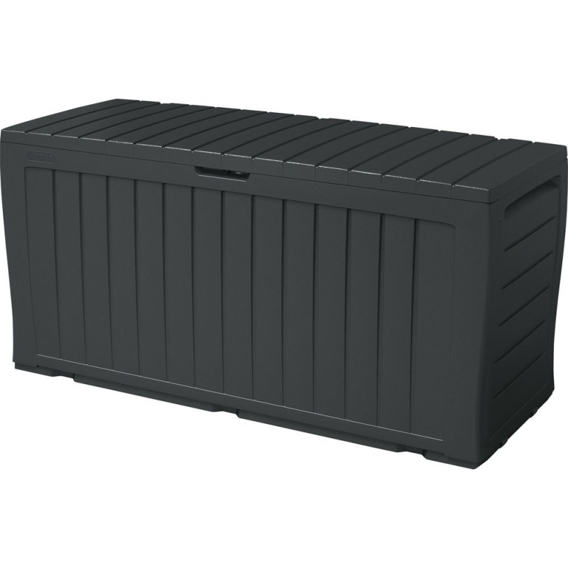 Plastový box pro uložení nejrůznějších předmětů (podušky, zahradní náčiní...) od firmy KETER. Výhodou tohoto boxu je jednoduchá montáž (bez využití nářadí - vše složíte jak stavebnici), vysoká kvalita boxu a moderní design. Materiál má UV ochranu a je odolný nepřízni počasí. Udrží až 200kg a tak ho můžete využít také jako lavičku. Vzhled boxu napodobuje strukturu dřeva - plastový box v imitaci dřeva.