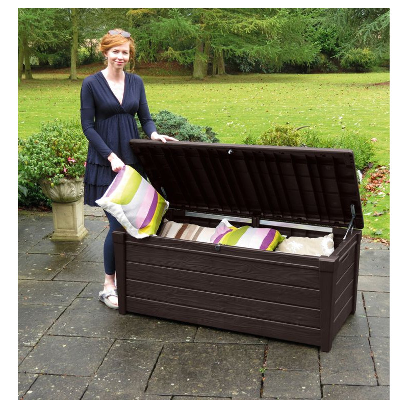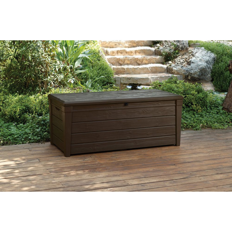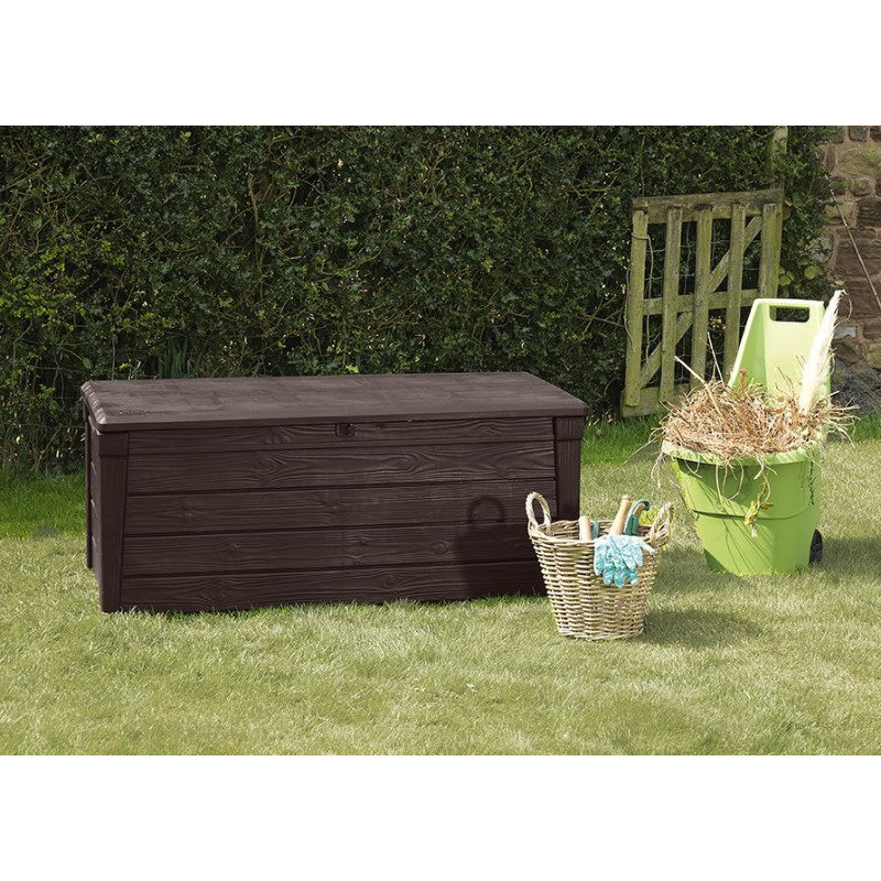 Väčší plastový box s úložným priestorom a objemom 455 l. Materiál: plast so vzorom imitácie dreva. Brightwood odkladací box umožňuje pohodlne uložiť všetko, čo chcete mať po ruke na Vašej záhrade. Vyznačuje sa veľkou kapacitou, vďaka tomu sa do neho zmestí napríklad záhradné náradie, vankúše alebo prikrývky. Jeho montáž je veľmi jednoduchá a nevyžaduje žiadne špecializované nástroje. Mechanizmus, ktorý uľahčuje otváranie veka, je nepochybne veľkou výhodou produktu.