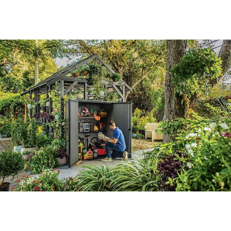 Objavte priestranné a štýlové riešenie pre uskladnenie všetkého záhradného náradia, grilu, hračiek či vankúšov. Moderný dizajn a povrch pripomínajúci drevo skvele doplní každý záhradný domček a vytvorí harmonický priestor pre vaše veci.