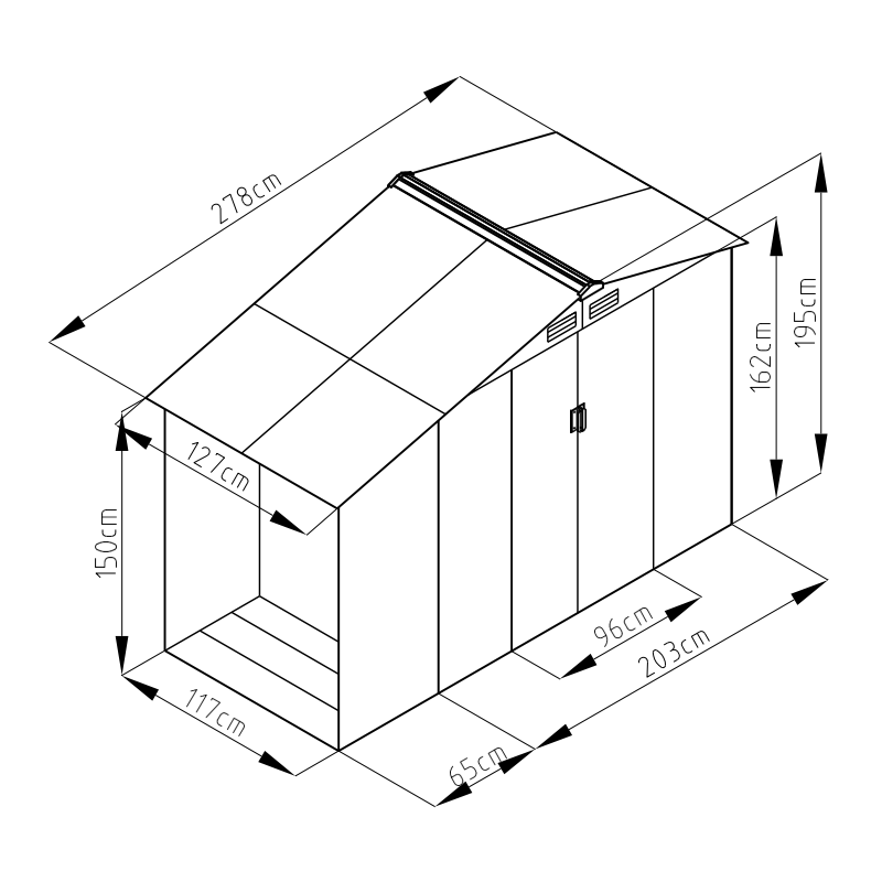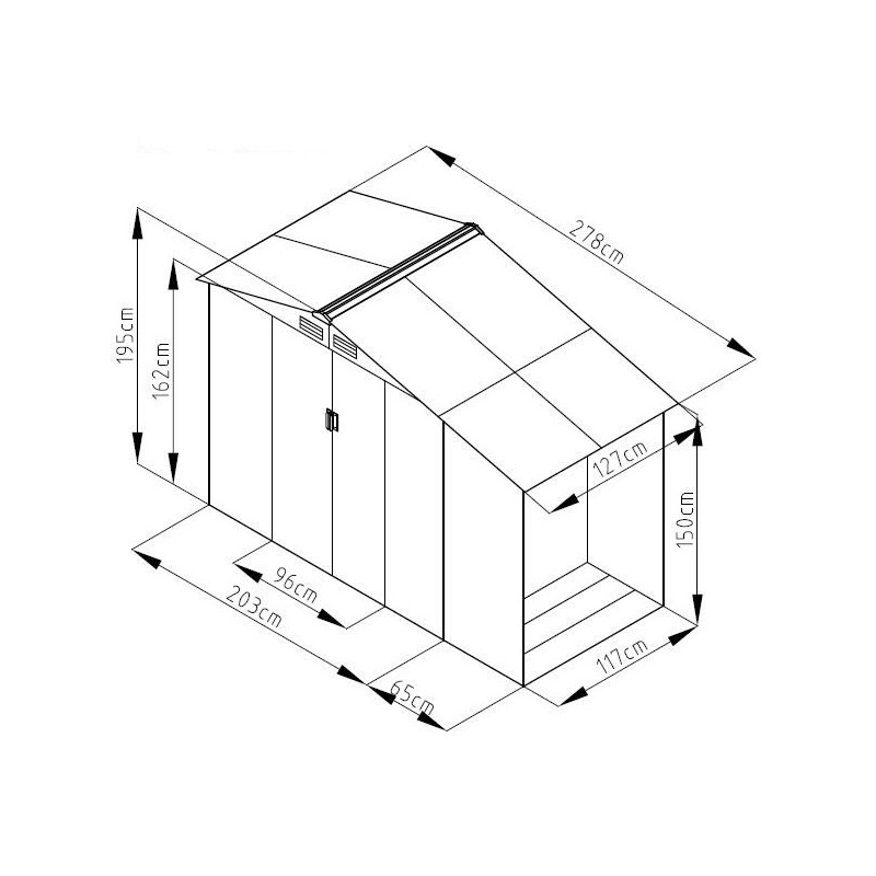 Záhradný domček využijete na uskadnenie napr. záhradného náradia, bicykla, kosačky, príslušenstva k bazénu, dreva atď. Záhradný domček v modernom dizajne sa hodí do každej záhrady. Domček má dvojité posuvné dvere, budete doň mať pohodlný prístup. Domček je vyrobený z kvalitných oceľových plechov. Oceľová, pozinkovaná konštrukcia s ventilačnými mriežkami. Domček je bez podlahy.