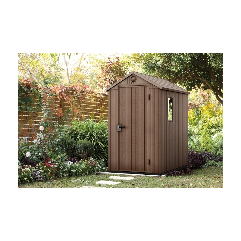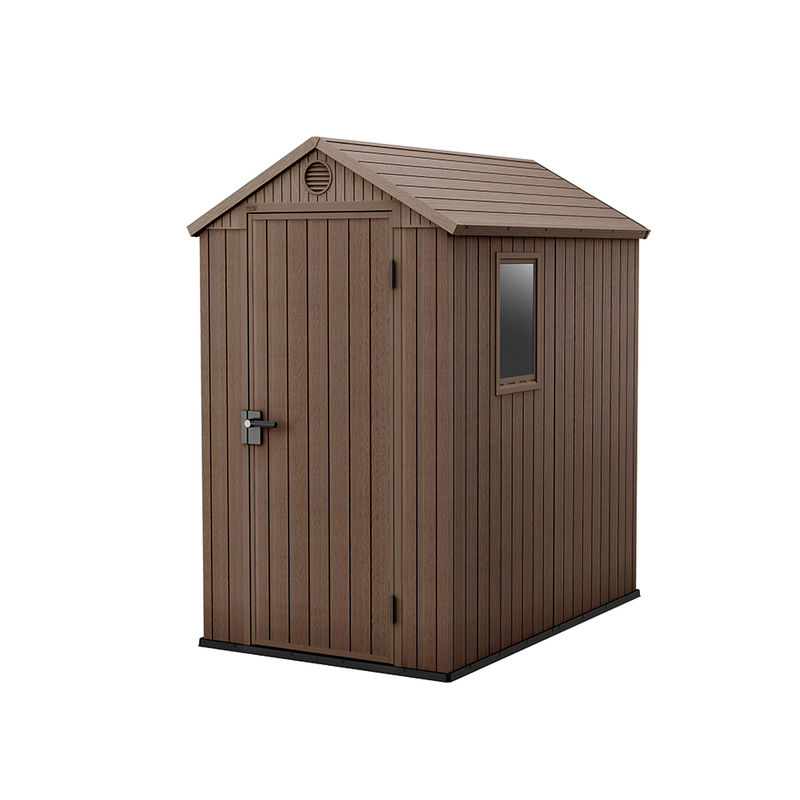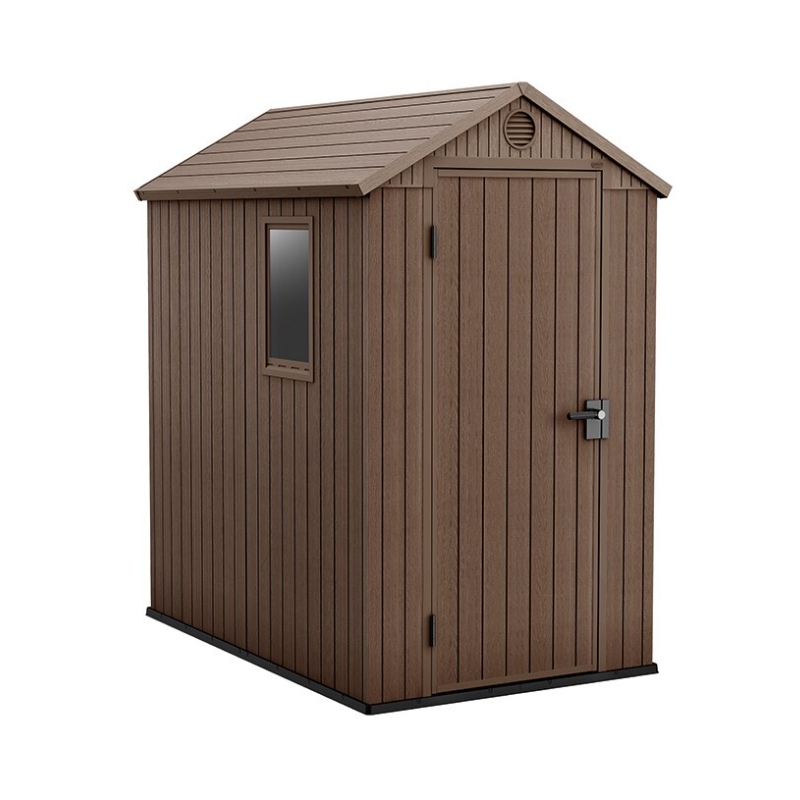 Strecha a stena produktu sú vyrobené z vysoko kvalitných materiálov odolných voči poveternostným vplyvom, prenikaniu vlhkosti a mechanickému poškodeniu. Veľký interiér umožňuje ukladať všetky druhy záhradného príslušenstva a vybavenia. Povrchová štruktúra imituje drevo. Vďaka jednoduchej údržbe nebudete mať s domčekom žiadne starosti.